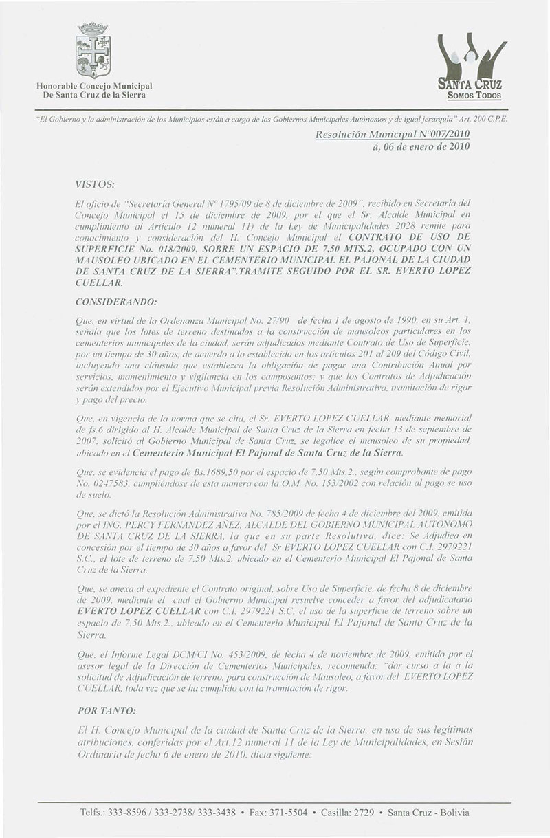 Aprueba el Contrato Nº 018/2009 referente al Uso de Superficie de Terreno, ocupado con un Mausoleo ubicado en el Cementerio Municipal El Pajonal, a favor del Sr. Everto López Cuéllar.