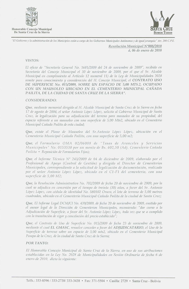 Aprueba el Contrato Nº 015/2009, referente al Uso de Superficie de Terreno, ocupado con un Mausoleo ubicado en el Cementerio Municipal Cañada Pailita, a favor del Sr. Antonio López López.