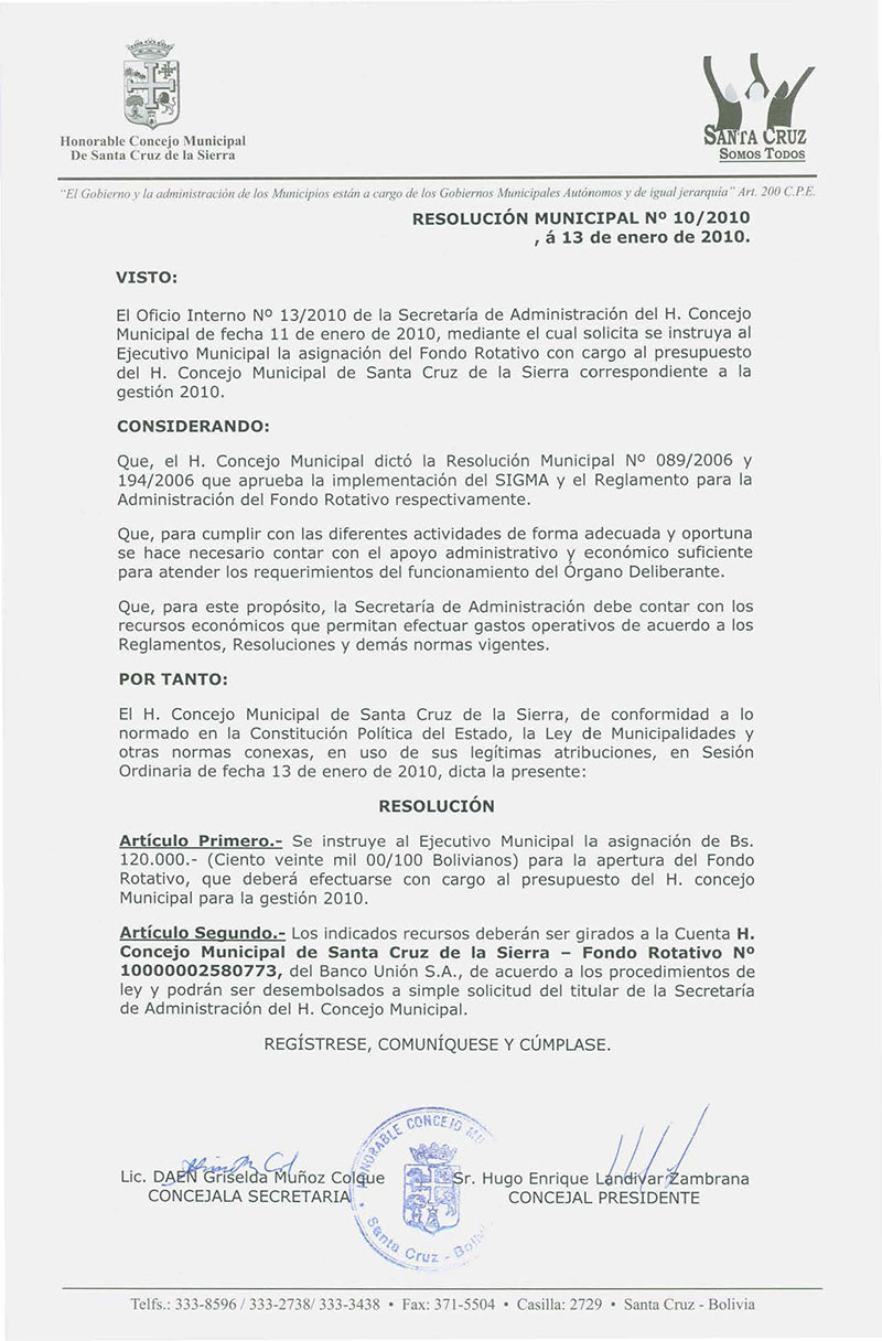Instruye al Ejecutivo Municipal la asignación de Bs. 120.000, para la Apertura de Fondo Rotativo del Concejo.