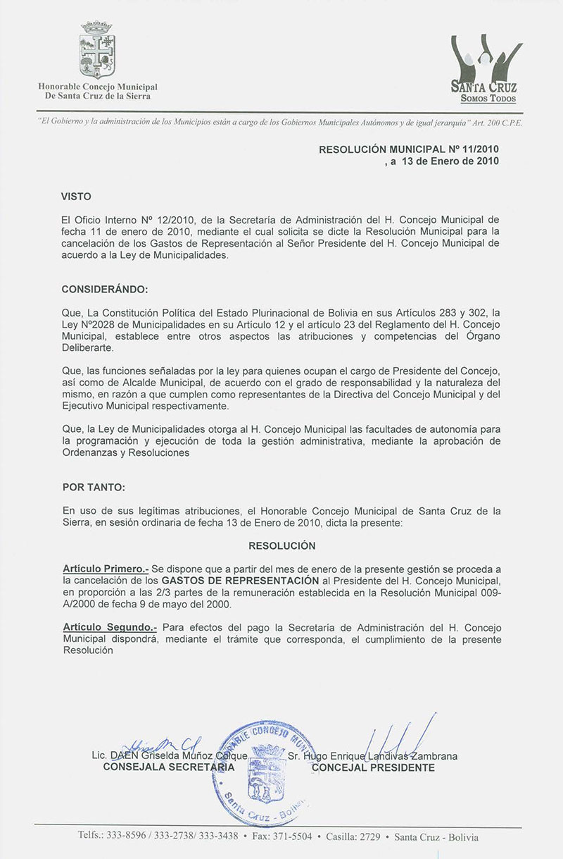 Dispone la Cancelación de Gastos de Representación al Presidente del H. Concejo Municipal.