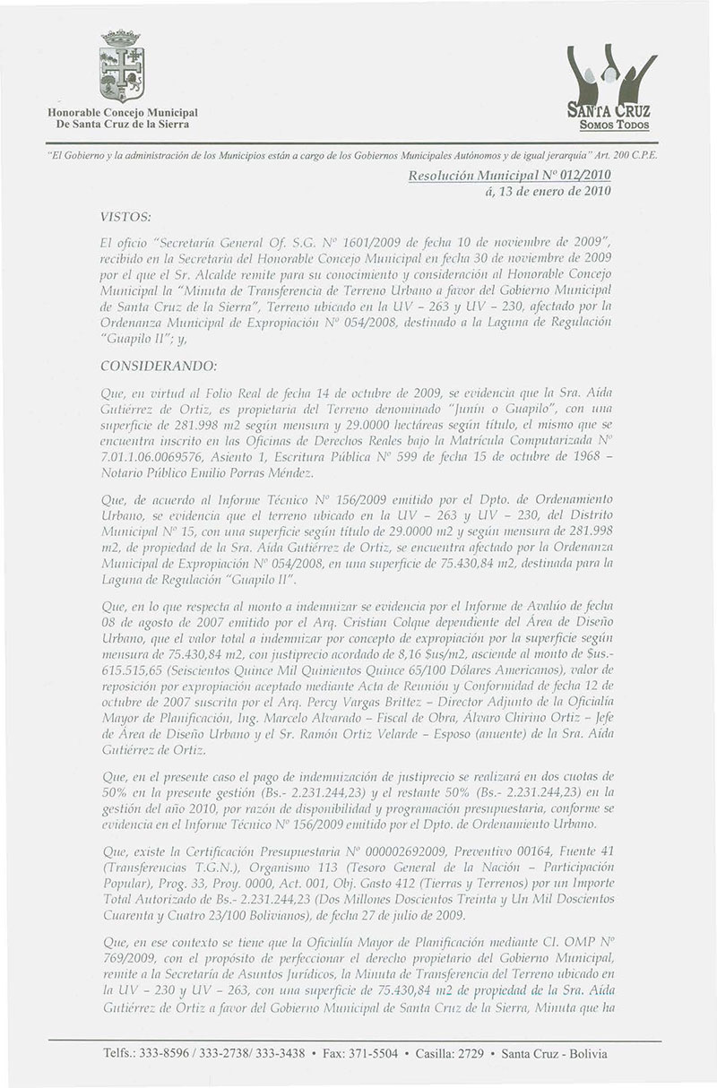 Aprueba la Minuta de Transferencia de Terreno Urbano a favor del Gobierno Municipal ubicado en la UV 263 y UV 230, destinado a la Laguna de Regulación Guapilo II, de propiedad de la Sra. Aida Gutiérrez de Ortiz.