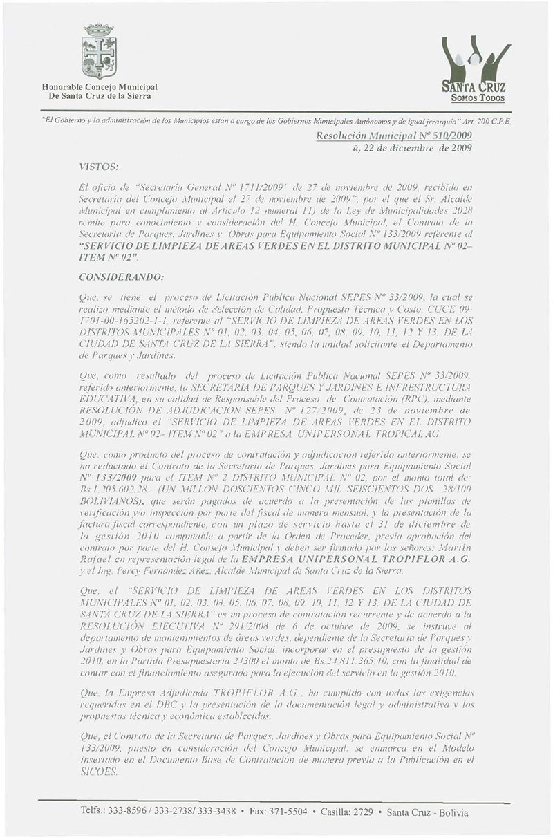 Aprueba el Contrato de la Secretaria de Parques, Jardines y Equipamiento Social No 133/2009 por el monto total de Bs.- 1,205,602,28; para el Servicio de Limpieza de áreas verdes en el Distrito Municipal No 02- ÍTEM No 02.