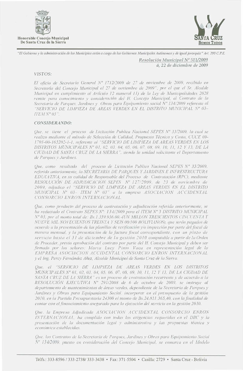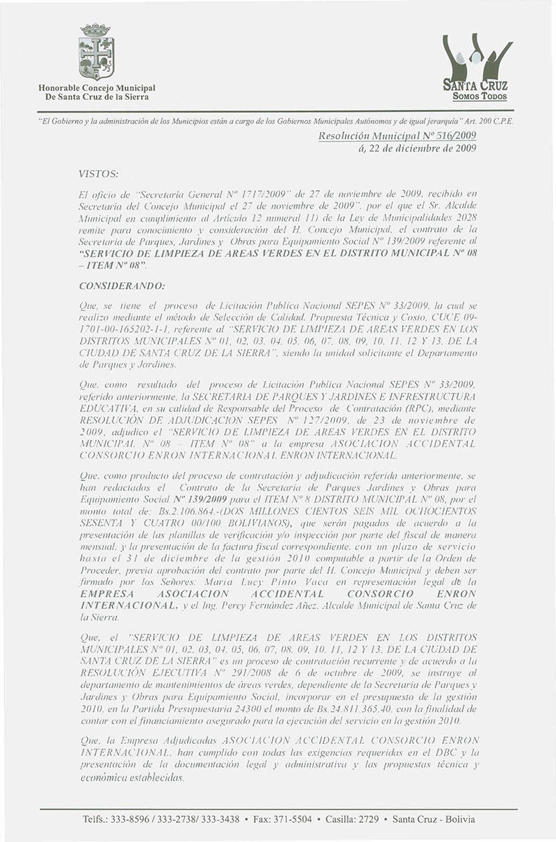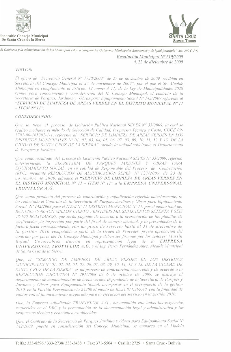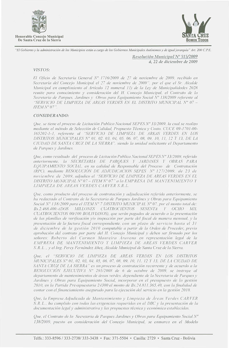 Aprueba el Contrato de la Secretaria de Parques, Jardines y Equipamiento Social No 138/2009 por el monto total de Bs.- 2,468,400; para el Servicio de Limpieza de áreas verdes en el Distrito Municipal No 07- ÍTEM No 07.