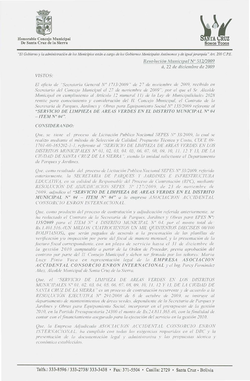 Aprueba el Contrato de la Secretaria de Parques, Jardines y Equipamiento Social No 135/2009 por el monto total de Bs.- 1,401,516,00; para el Servicio de Limpieza de áreas verdes en el Distrito Municipal No 04- ÍTEM No 04.