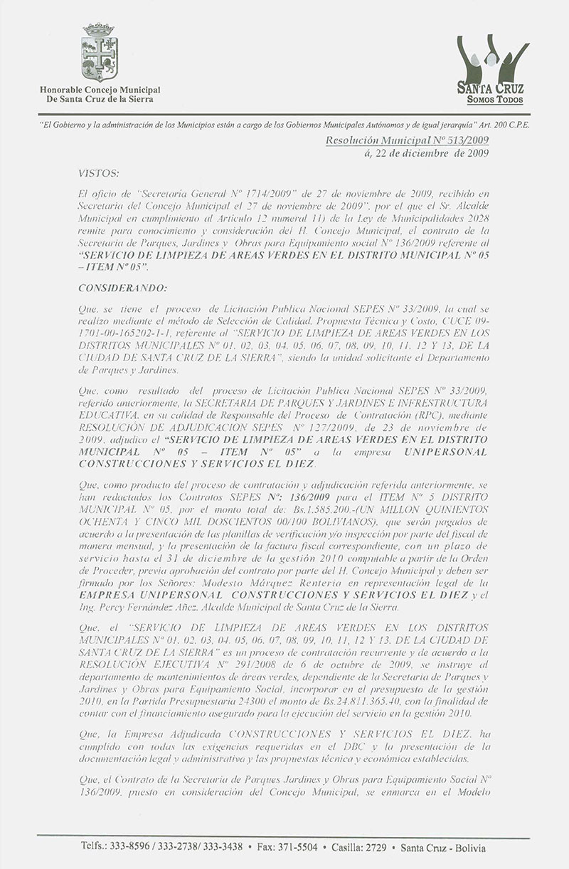 Aprueba el Contrato de la Secretaria de Parques, Jardines y Equipamiento Social No 136/2009 por el monto total de Bs.- 1,585,200; para el Servicio de Limpieza de áreas verdes en el Distrito Municipal No 05- ÍTEM No 05.