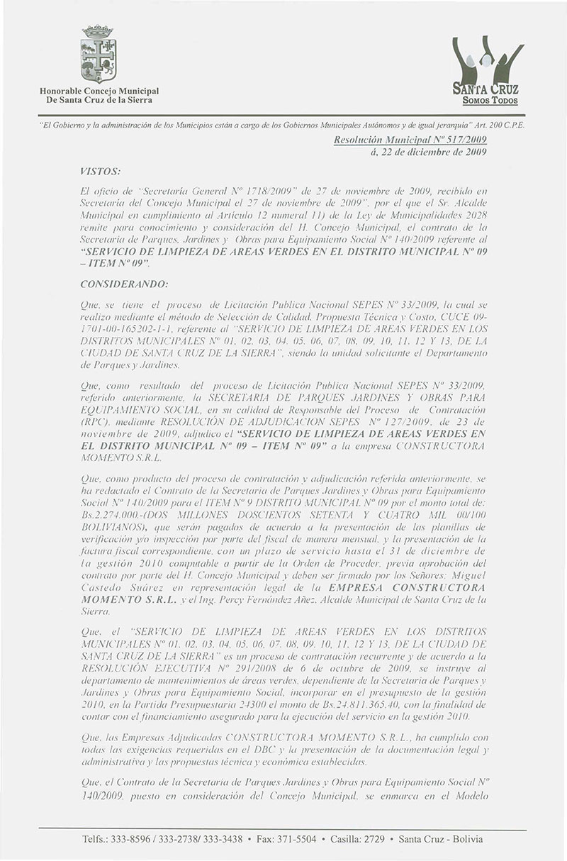 Aprueba el Contrato de la Secretaria de Parques, Jardines y Equipamiento Social No 137/2009 por el monto total de Bs.- 3,855.000; para el Servicio de Limpieza de áreas verdes en el Distrito Municipal No 06- ÍTEM No 06.