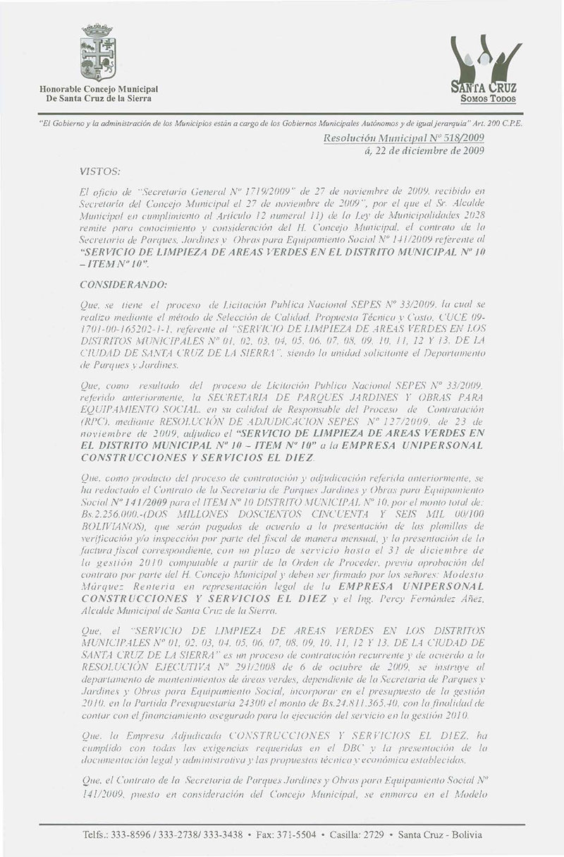 Aprueba el Contrato de la Secretaria de Parques, Jardines y Equipamiento Social No 141/2009 por el monto total de Bs.- 2,256,000; para el Servicio de Limpieza de áreas verdes en el Distrito Municipal No 10- ÍTEM No 10.