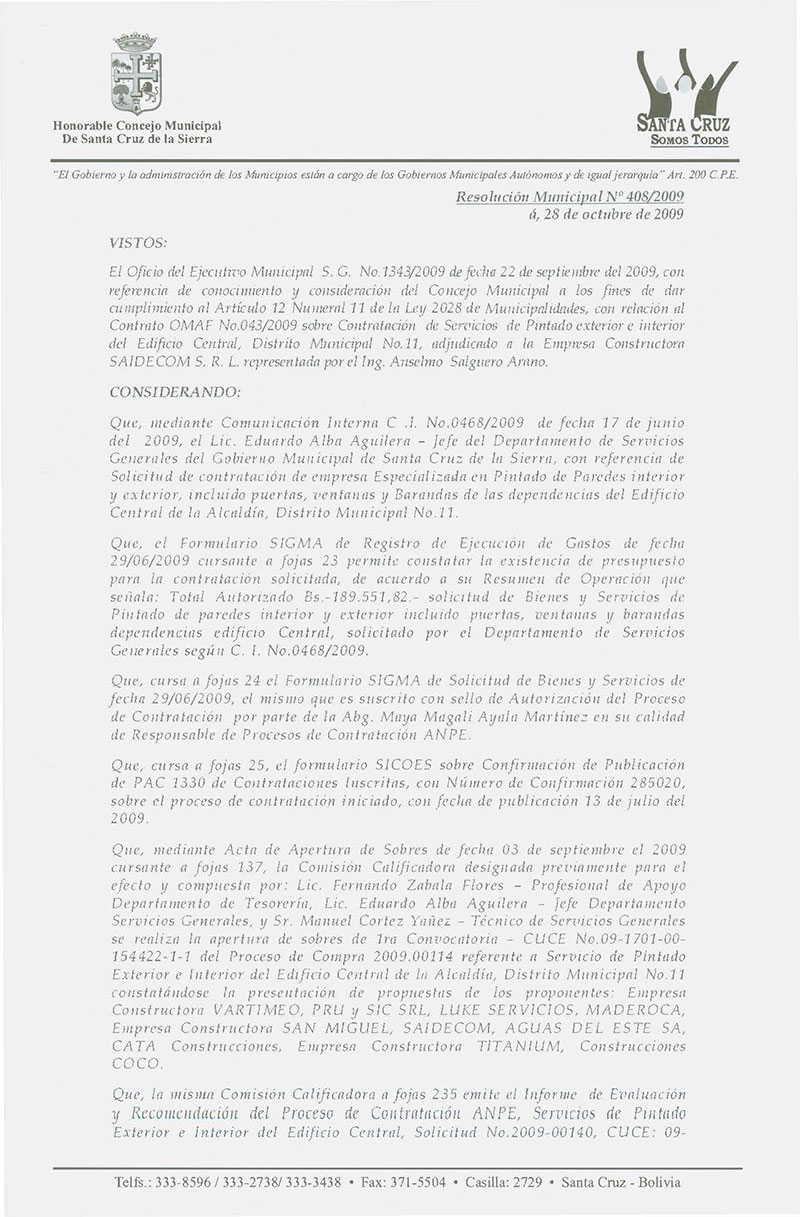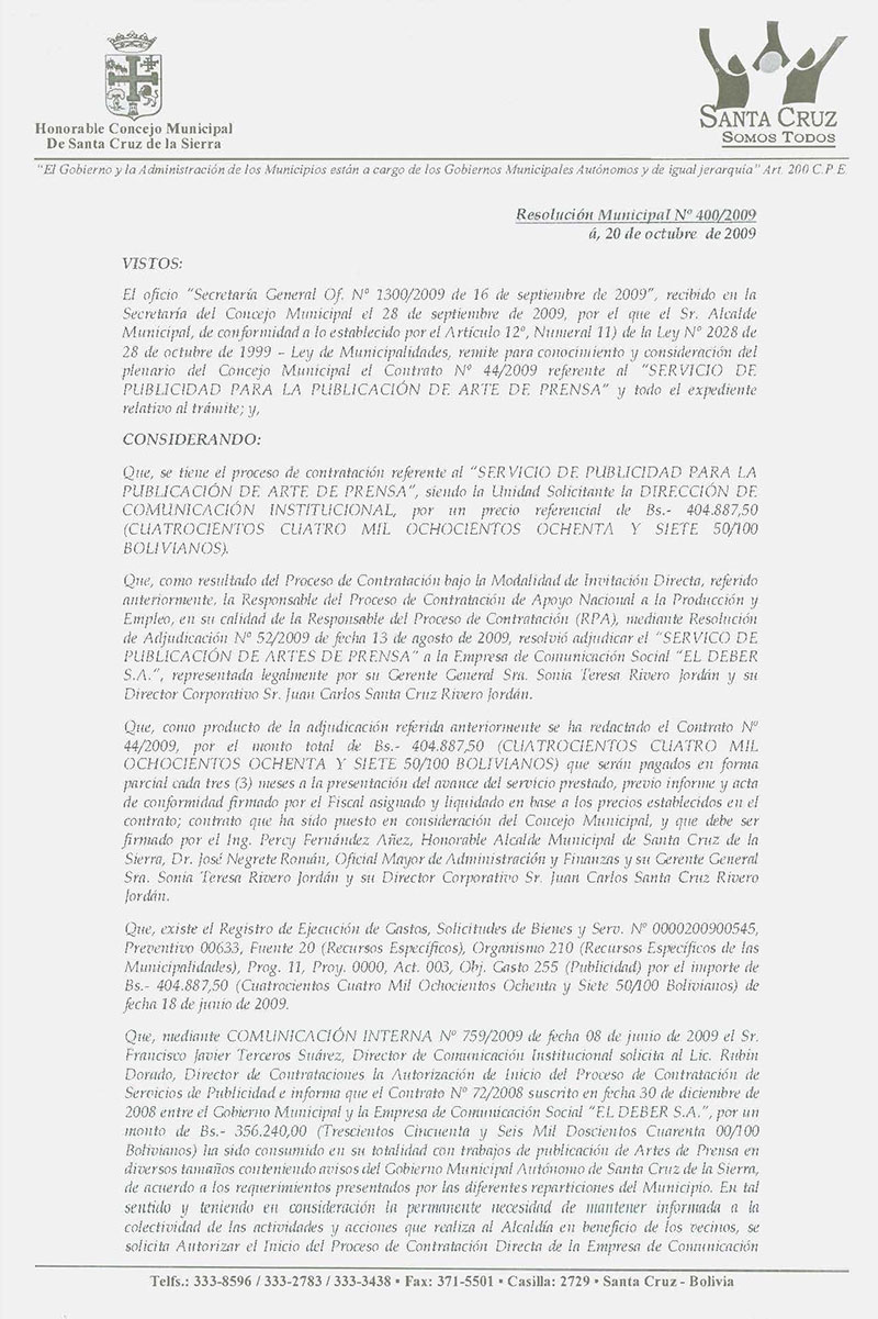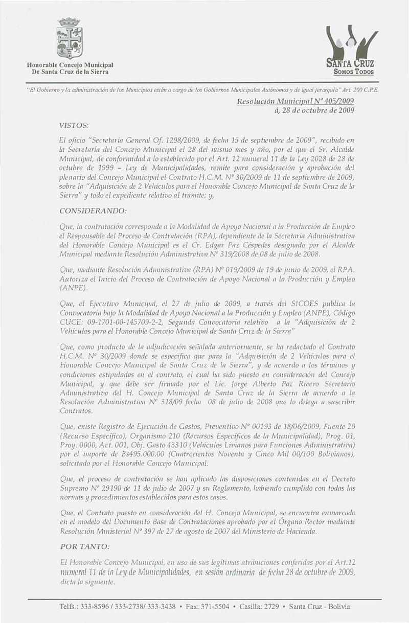 Aprueba el Contrato de la Secretaria Administrativa del H. Concejo Municipal NO 30/2009 del 11 de septiembre del 2009, por el monto de Bs.- 406,600,00.- para la adquisición de 2 vehículos para el Honorable Concejo Municipal de Santa Cruz de la Sierra.