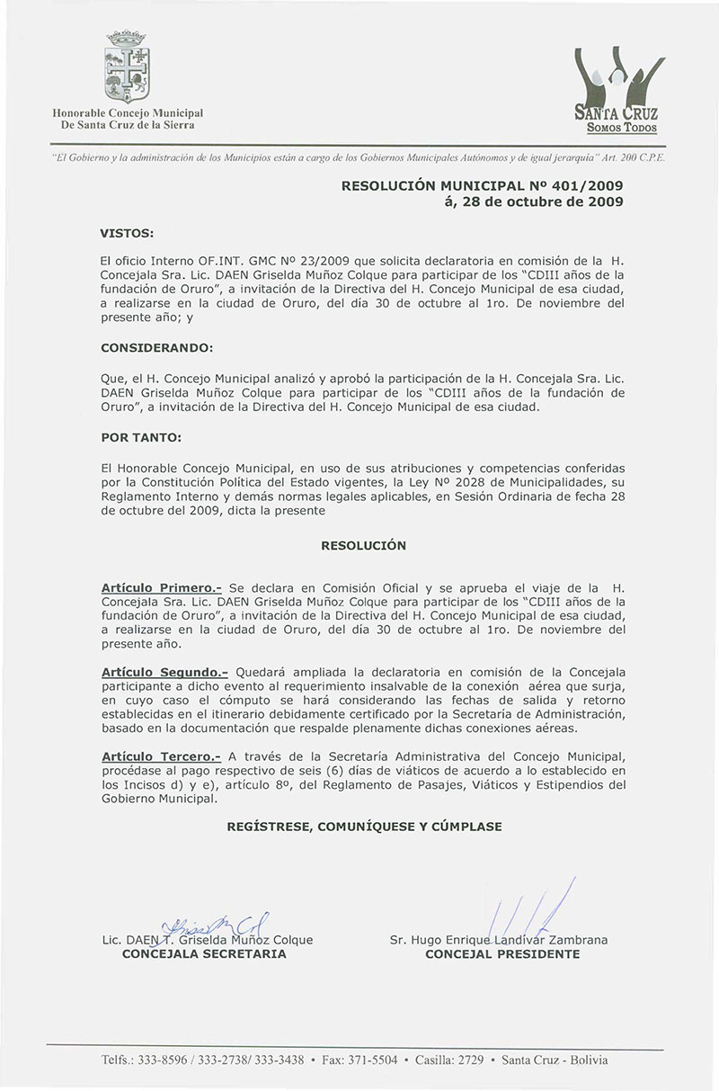Declara en Comisión Oficial y se aprueba el viaje de la H. Concejala Lic. Griselda Muñoz Colque para participar de los CDIII años de la Fundación de Oruro.