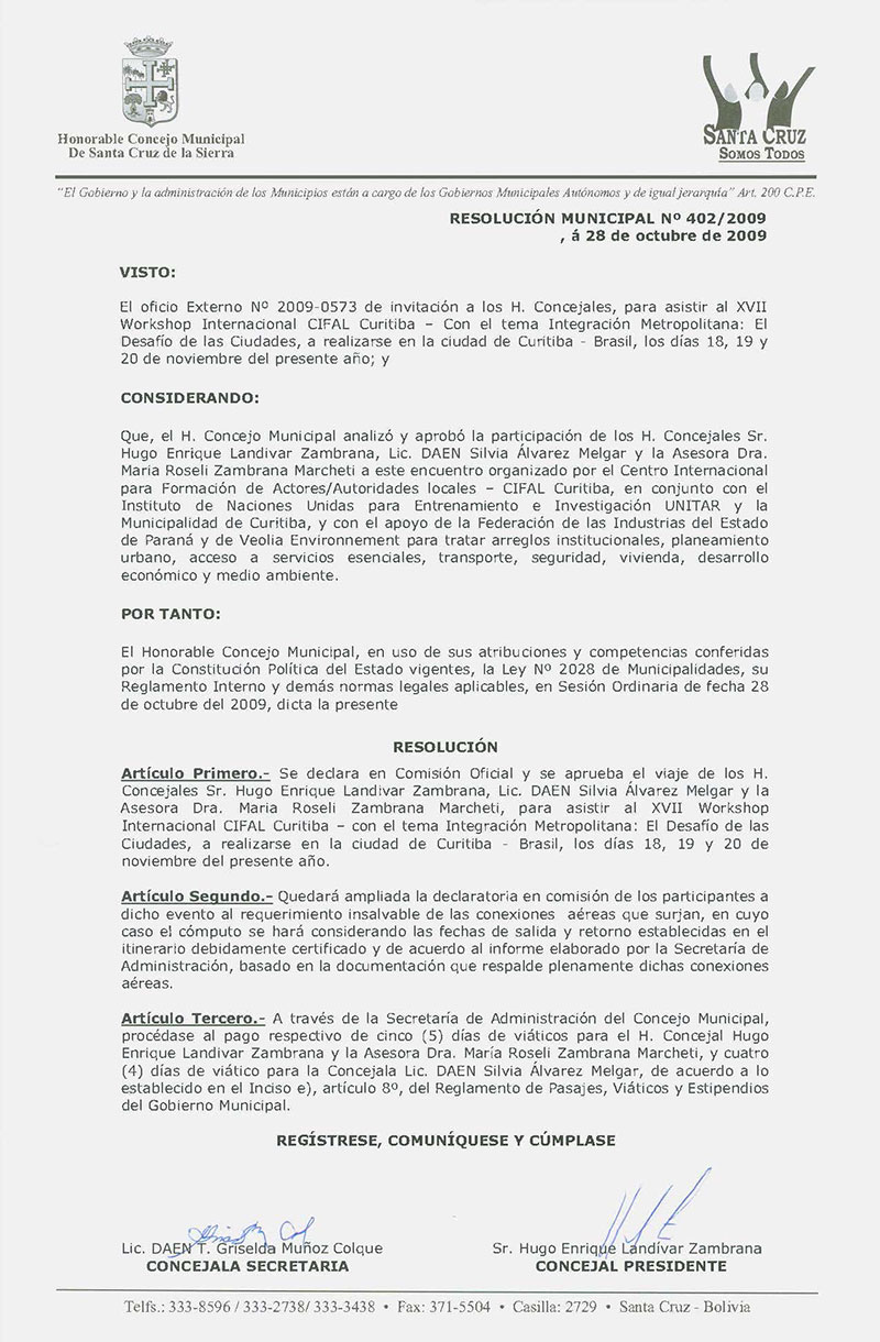 Declara en Comisión Oficial y se Aprueba el viaje de los H. Concejales Hugo Enrique Landivar, Lic. DAEN Silvia Álvarez y la Asesora Dra. María Roseli para asistir al XVII Workshop Internacional a realizarse en la ciudad de Curitiba-Brasil los días 18, 19 y 20 de noviembre del presente año.