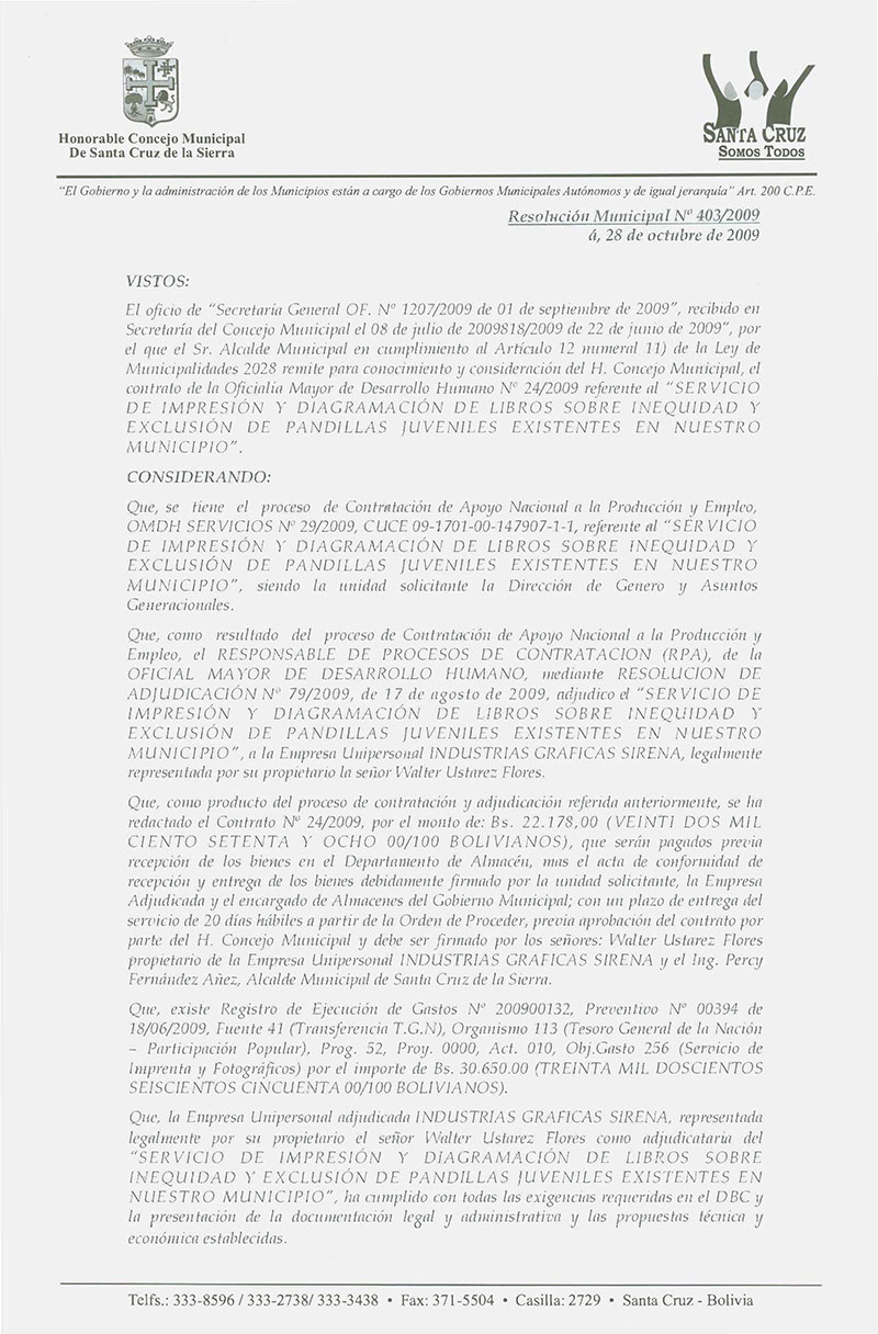 Aprueba el Contrato No 24/2009, por el monto de Bs.- 22,178,00, para el Servicio de Impresión y Diagramación de libros sobre inequidad y exclusión de pandillas juveniles existentes en nuestro Municipio.