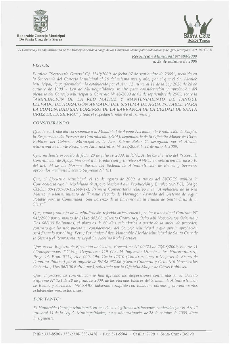 Aprueba el Contrato No 43/2009, por el monto de Bs.- 148,982.06.- para la Ampliación de la Red Matriz y Mantenimiento de Tanque elevado de Hormigón Armado del Sistema de Agua potable para la Comunidad San Lorenzo de la Barranca de la Ciudad de Santa Cruz de la Sierra.