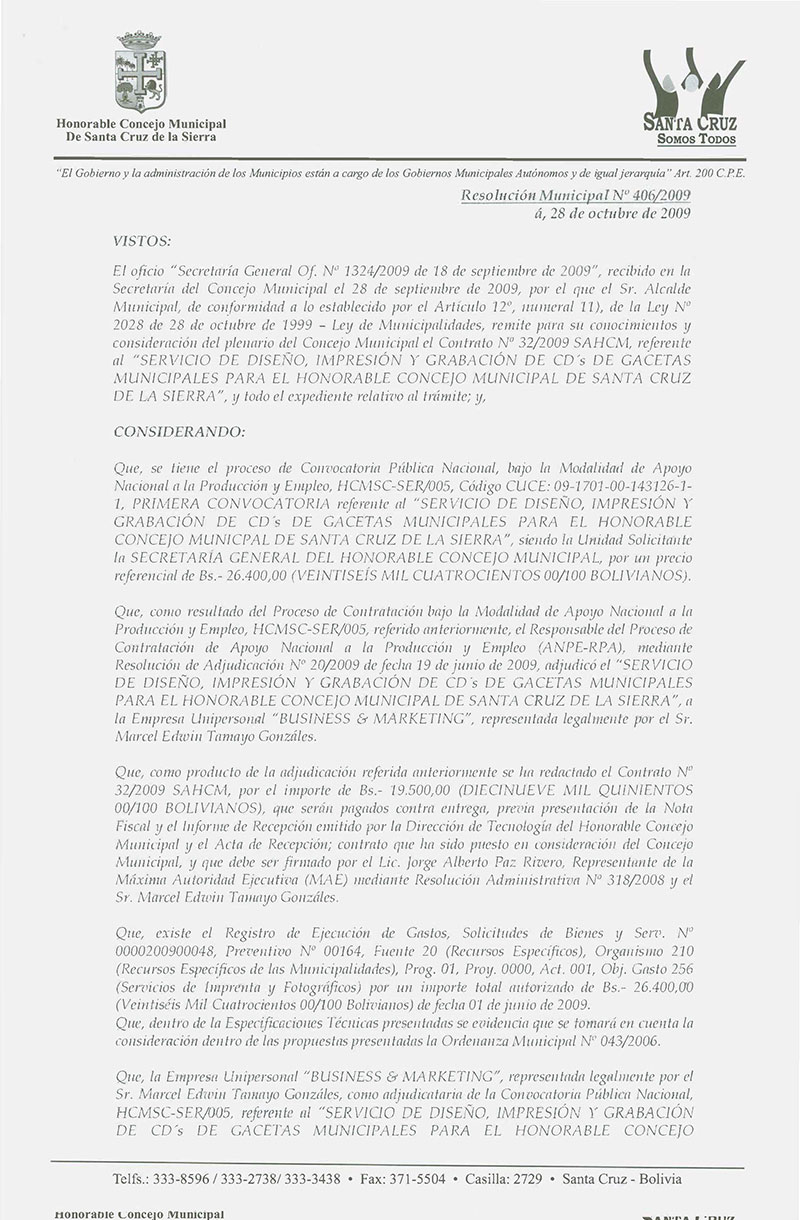 Aprueba el Contrato de la Secretaria Administrativa del H. Concejo Municipal NO 32/2009 SAHCM por el importe total de Bs.- 19,500.00, referente al Servicio de Diseño, Impresión y Grabación de CD´s de Gacetas Municipales para el Honorable Concejo Municipal de Santa Cruz de la Sierra.