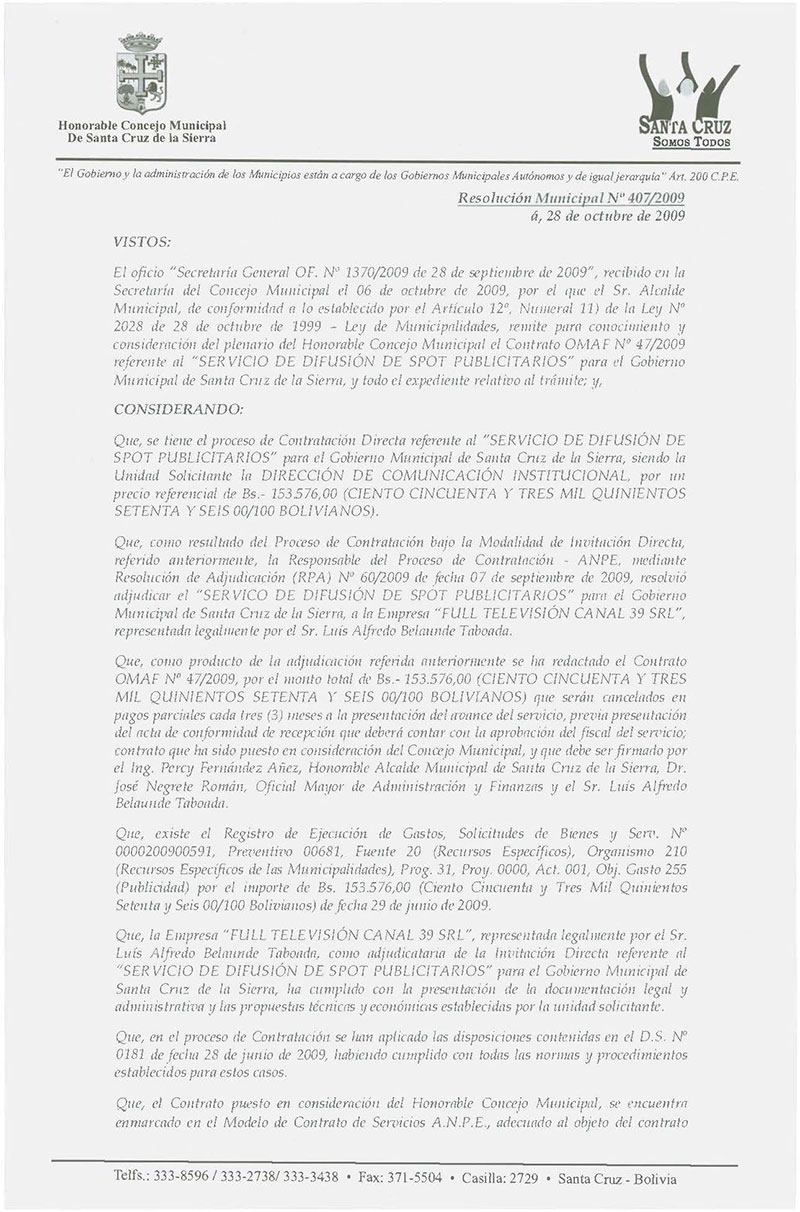 Aprueba el Contrato de la Oficialía Mayor de Administración y Finanzas No 47/2009 por el importe total de Bs.- 153,576.- referente al "Servicio de Difusión de Spot Publicitario.