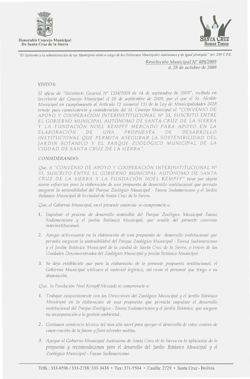 Aprueba el Convenio de Apoyo y Cooperación Interinstitucional No. 33/2009, suscrito entre el Gobierno Municipal y La Fundación Noel Kemff Mercado para elaborar una propuesta de Desarrollo Institucional que permita asegurar la sostenibilidad del Jardín Botánico y el Parque Zoológico Municipal de la Ciudad de Santa Cruz.