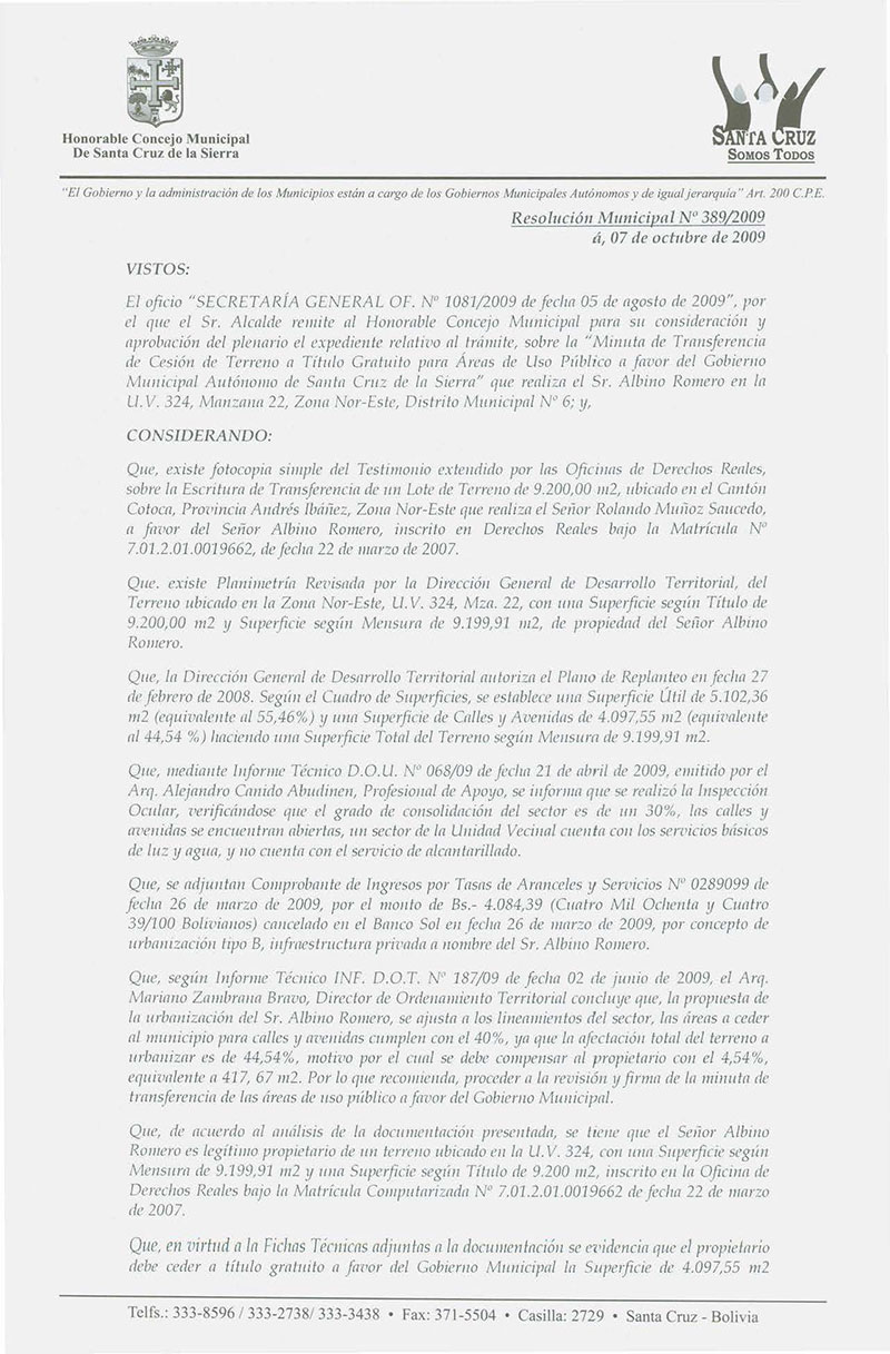 Aprueba la "Minuta de transferencia de Cesión de Terreno a título gratuito para áreas de uso público a favor del municipio que realiza el Sr. Albino Romero en la UV-324, Mza No 22, Zona Nor-Este, Distrito Municipal No 6.