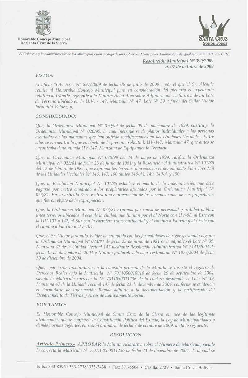 Aprueba la Minuta Aclarativa sobre el número de matrícula de la cual se desprende el Lote No 39 UV-147 Mza 47 a favor del Sr. Víctor Jaramillo Valdes.