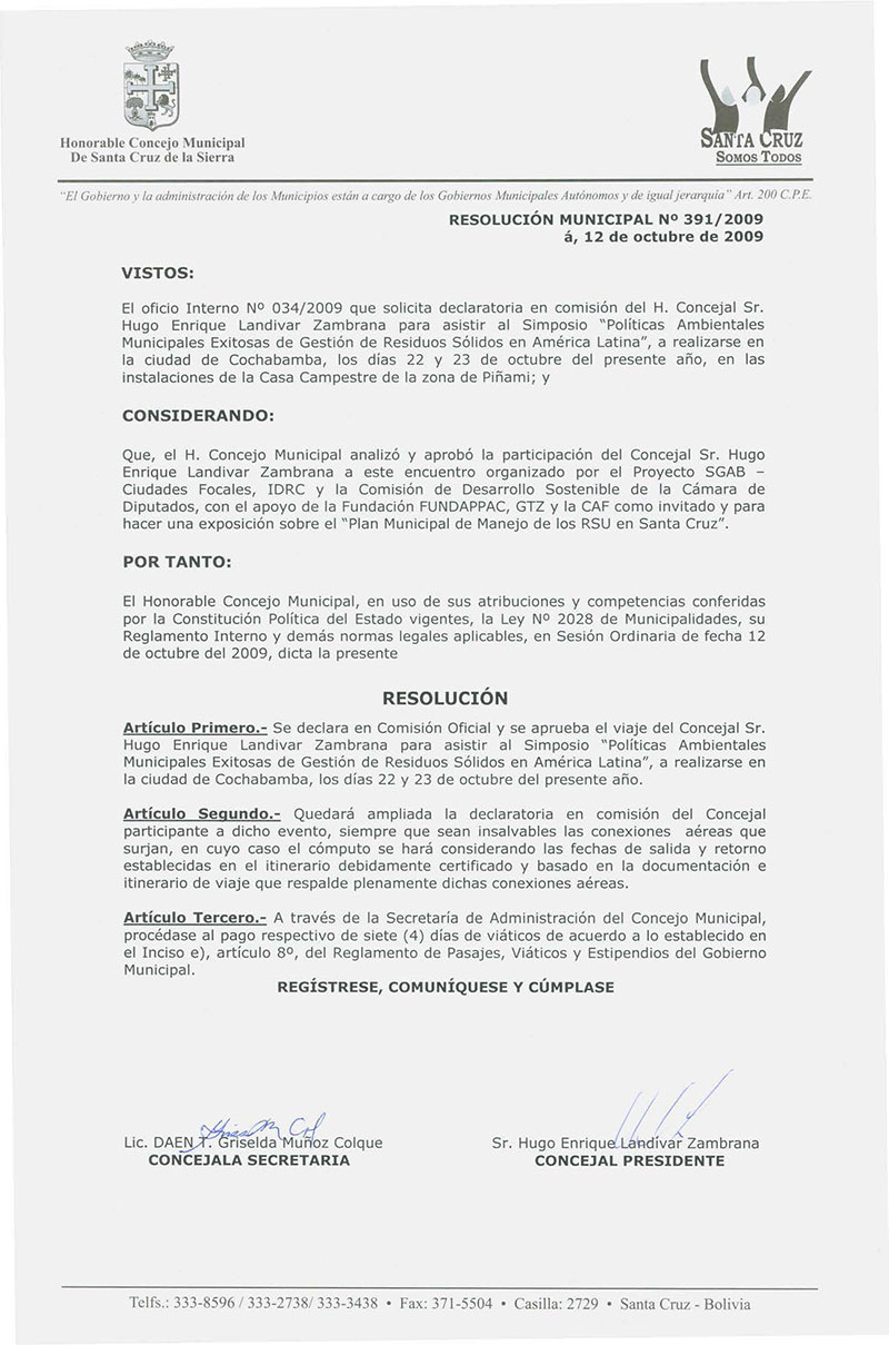 Se declara en Comisión Oficial y se aprueba el viaje del Concejal Sr. Hugo Enrique Landivar Zambrana para asistir al Simposio "Políticas Ambientales Municipales Exitosas de Gestian de Residuos Salidos en América Latina", a realizarse en la ciudad de Cochabamba, 105 dias 22 y 23 de octubre del presente ano.