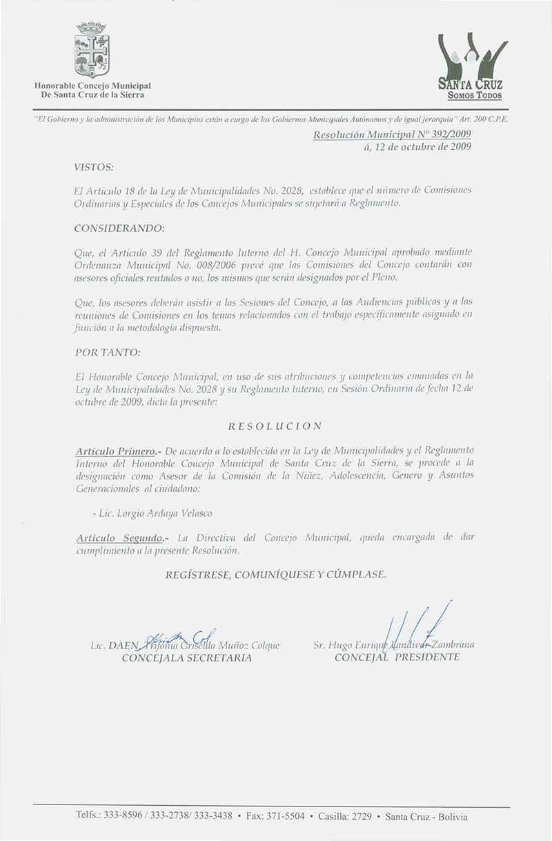 Designa como Asesor de la Comisión de la Niñez, Adolescencia, Género y Asuntos Generacionales al Ciudadano Lic. Lorgio Ardaya Velasco.