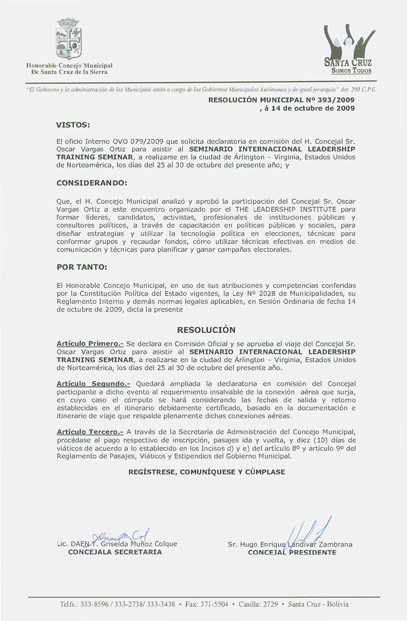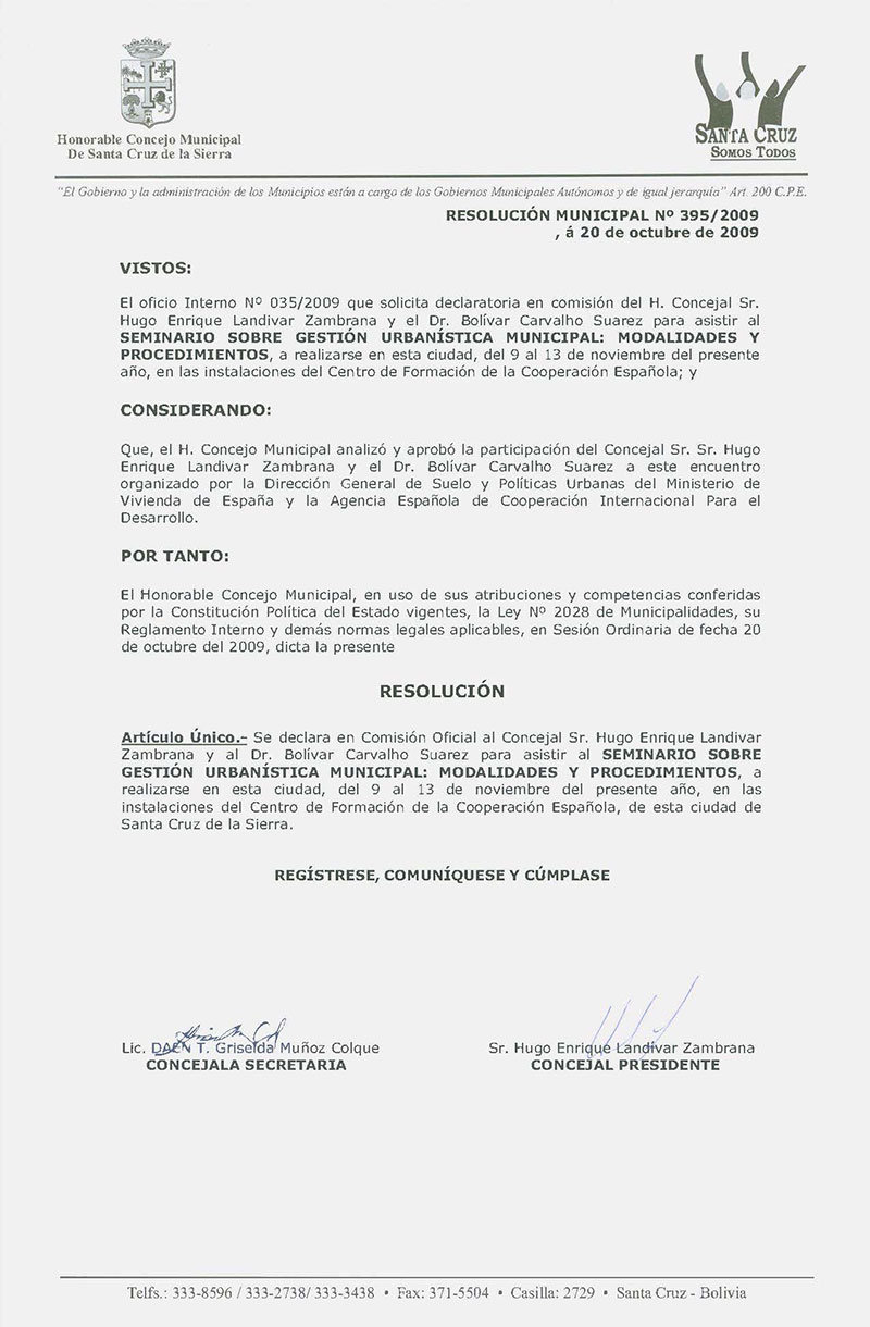 Declara en Comisión Oficial al Concejal Sr. Hugo Enrique Landivar Zambrana y el Abog. Bolívar Carvalho Suárez para Asistir al Seminario sobre gestión Urbanística Municipal a realizarse en esta ciudad del 9 al 13 de noviembre del presente año.