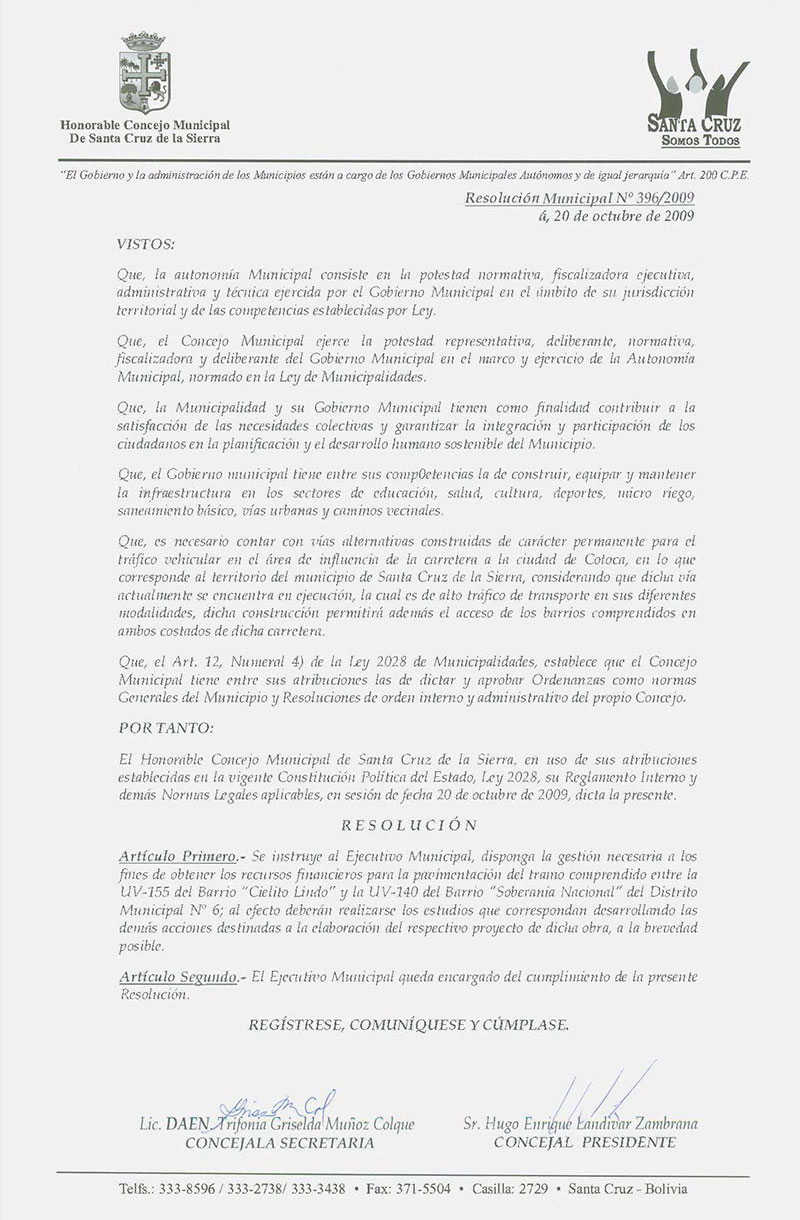 Instruye al Ejecutivo Municipal, realice las gestiones necesaria a los fines de obtener los recursos financieros para la pavimentación del tramo comprendido entre la UV-155 del Barrio "Cielito Lindo" y la UV-140 del "Barrio Soberanía Nacional" del Distrito Municipal N° 6.