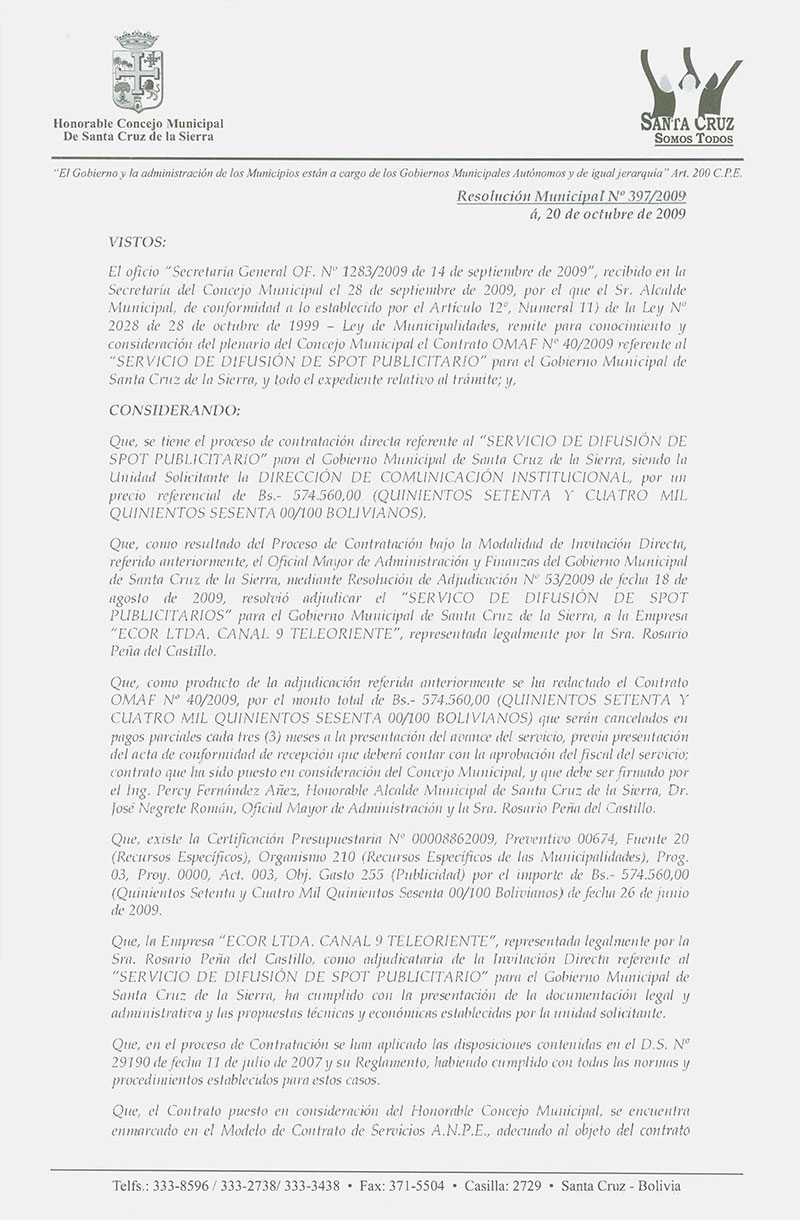 Aprobación del Contrato OMAF No 40/2009 por el importe de Bs.- 574,560,00 para el "Servicio de Difusión de Spot Publicitario" para el Gobierno Municipal de Santa Cruz de la Sierra, adjudicado a la Empresa "ECOR Ltda. Canal 9 Teleoriente".