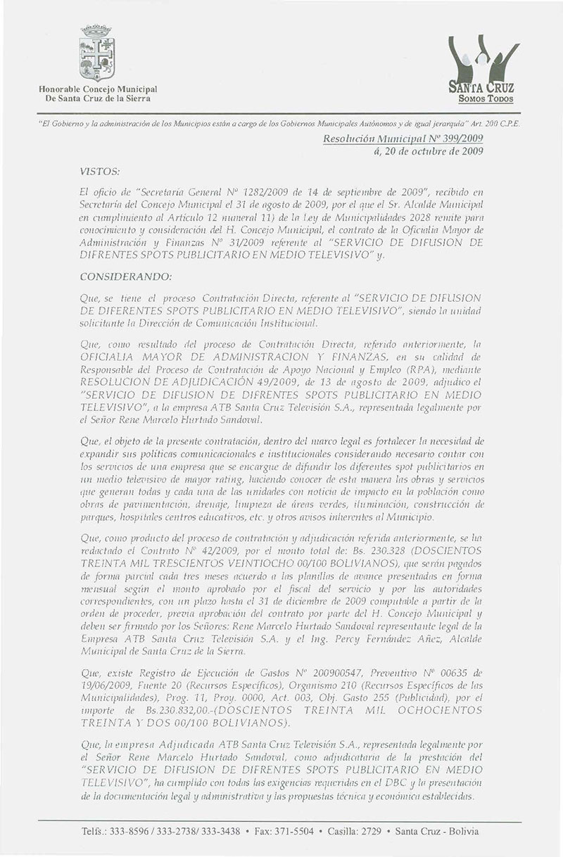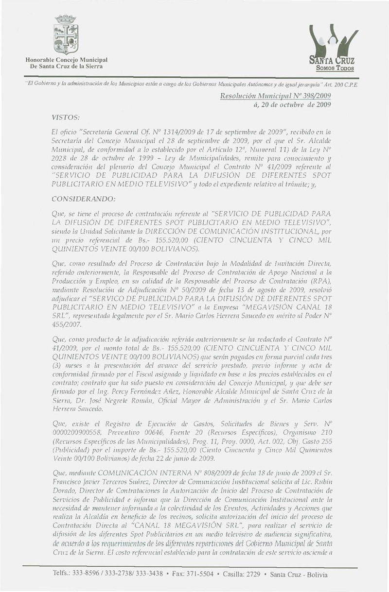 Aprueba el Contrato No 41/2009 por el importe de Bs.- 155,520,00 referente al Servicio de Publicidad para la difusión de diferentes spot publicitario en medio televisivo.