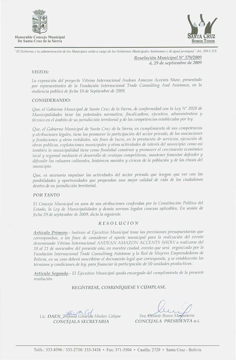 Instruye al Ejecutivo Municipal tome las previsiones presupuestarias que correspondan, a los fines de considerar el aporte municipal para la realización del evento denominado Vitrina Internacional ANDEAN AMAZON ACCENTS SHOW a realizarse del 18 al 21 de noviembre del presente año.