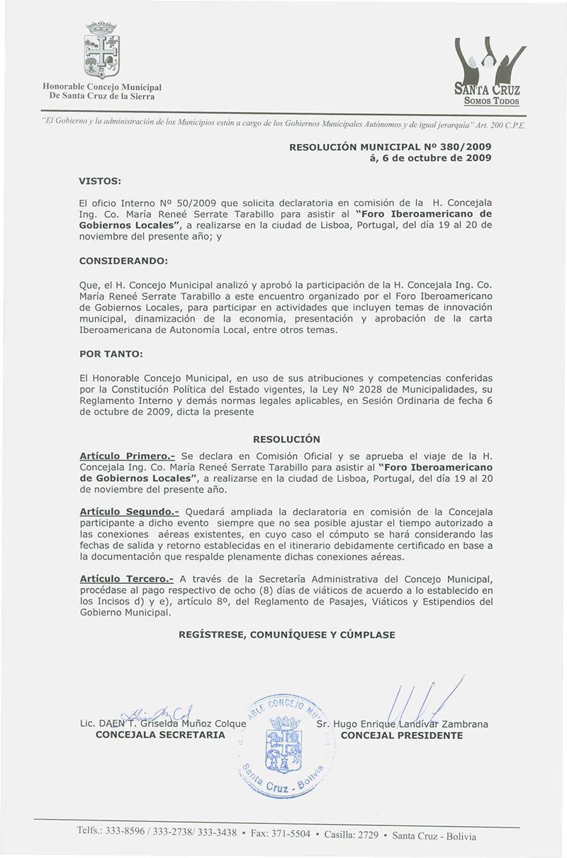 Declara en Comisión Oficial y se aprueba el viaje de la H. Concejala Ing. Co. María René Serrate Tarabillo para asistir al "Foro Iberoamericano de Gobiernos Locales", a realizarse en la ciudad de Lisboa Portugal del 19 al 20 de noviembre del presente año.