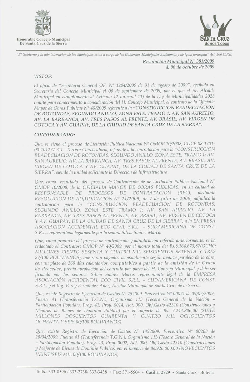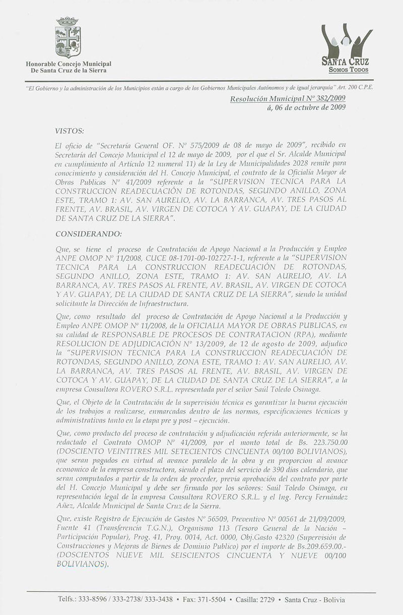 Aprueba el Contrato de Oficiaía Mayor de Obras Públicas No 41/2009 por Bs.- 223,750,00 para la "Supervisión Técnica para la construcción, readecuación de rotondas, segundo anillo, zona este, tamo 1: Av. San Aurelio, Av. La Barranca, Av. Tres Pasos al frente, Av. Brasil, Av. Virgen de Cotoca y Av. Guapay, de la Ciudad de Santa Cruz de la Sierra.
