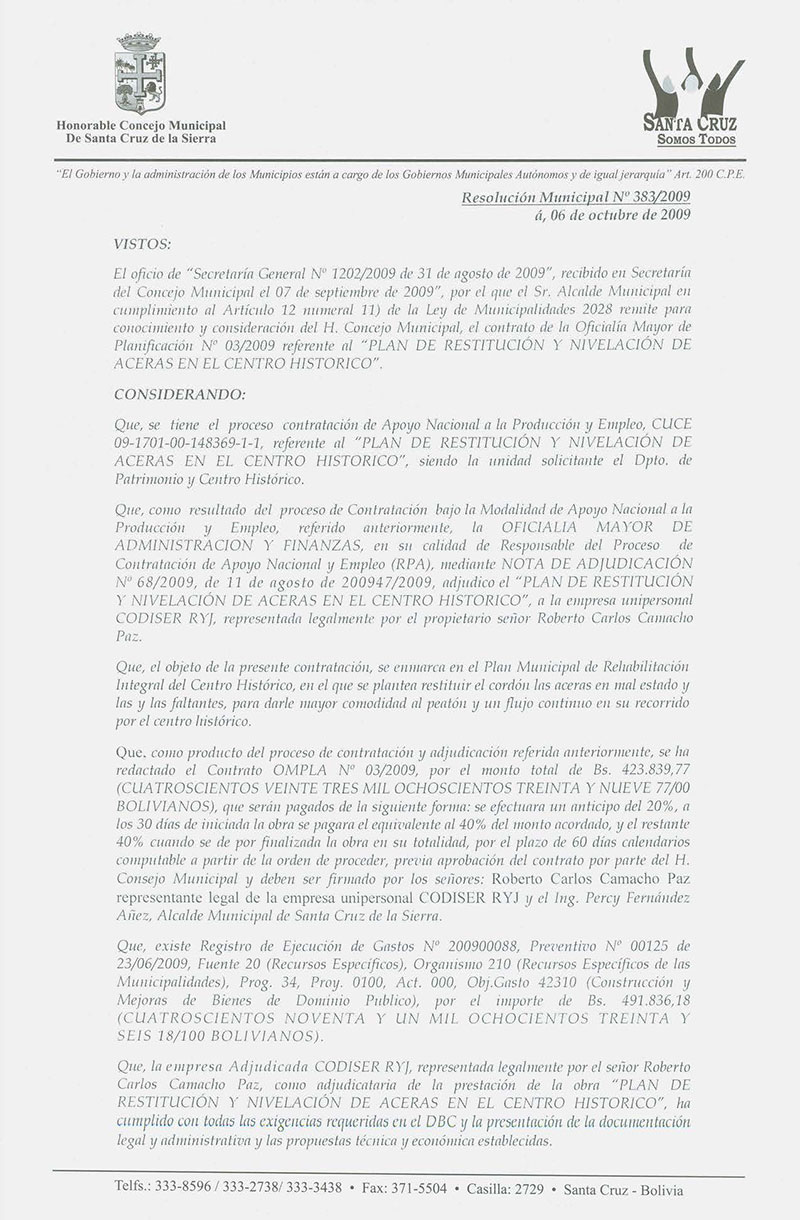 Aprueba el Contrato de la Oficialía Mayor de Planificación No 03/2009, por el monto total de Bs.- 423,839,77 para el "Plan de restitución y nivelación de aceras en el centro histórico.