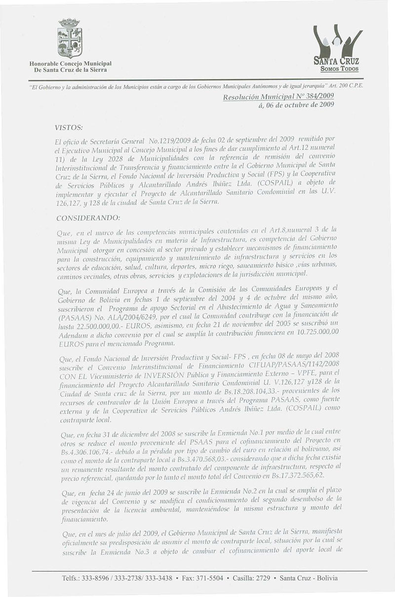 Aprueba el Convenio Interinstitucional de transferencia y financiamiento suscrito entre el Gobierno Municipal y el Fondo Nacional de Inversión Productiva y Social (FPS) y la Cooperativa de Servicios Públicos y Alcantarillado Andrés Ibáñez (COSPAIL).