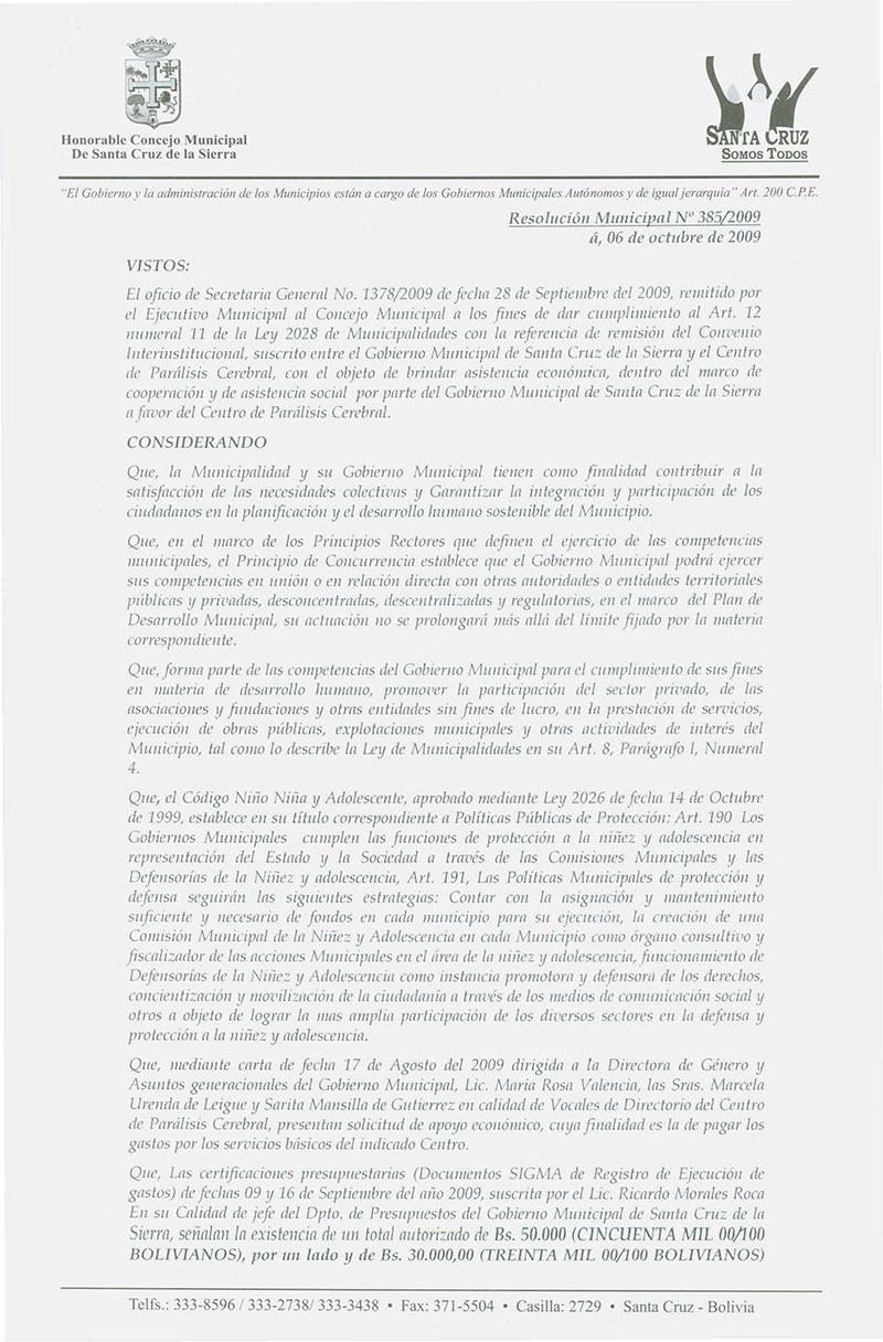Aprueba el Convenio Interinstitucional suscrito entre el Gobierno Municipal y el Centro de Parálisis Cerebral.