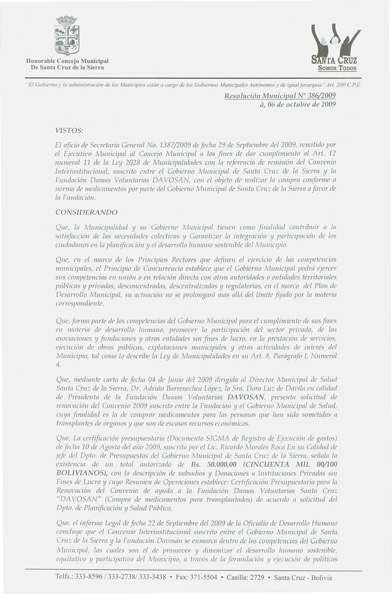 Aprueba el Convenio Interinstitucional con la Fundación Damas Voluntarias Santa Cruz "DAVOSAN".