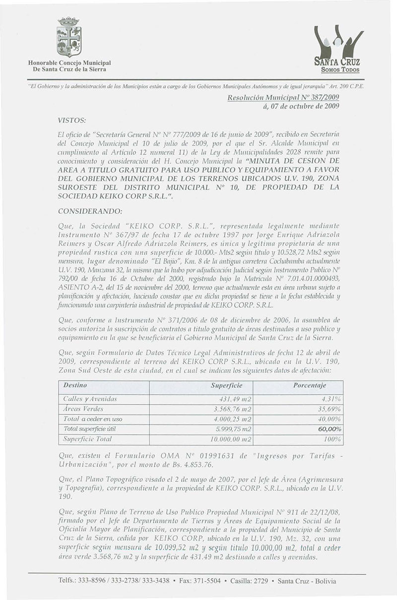 Aprueba la Minuta de Cesión de área a título gratuito para uso público y equipamiento a favor del Gobierno Municipal de los terrenos de propiedad de la Sociedad Keiko Corp. S.R.L.
