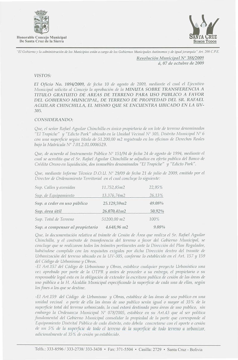 Aprueba el Contrato de Oficialía Mayor de Obras Públicas No 40/2009, por Bs.- 8,164,673,87.- para la "Construcción readecuación de rotondas, segundo anillo, zona este, tramo 1: Av. San Aurelio, Av. La Barranca, Av. Tres Pasos al frente, Av. Brasil, Av. Virgen de Cotoca y Av. Guapay de la Ciudad de Santa Cruz de la Sierra.