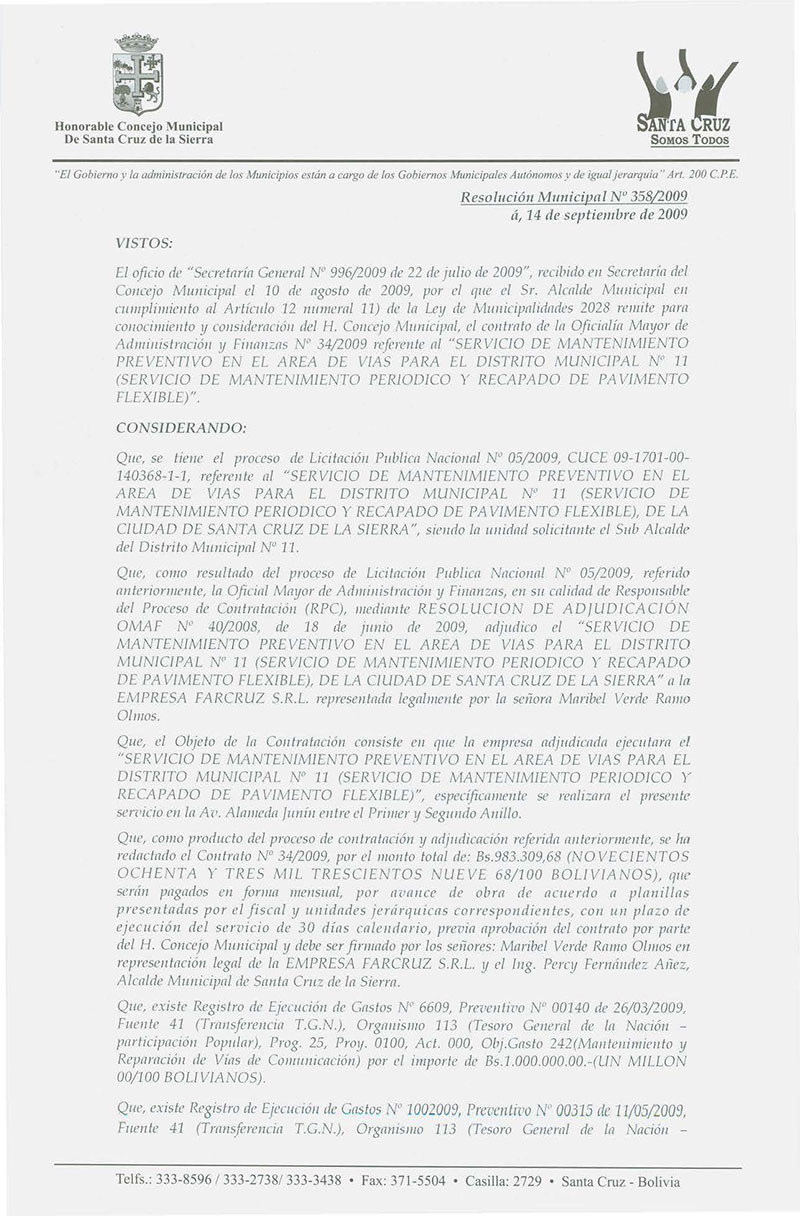 Aprueba el Contrato de la Oficialía Mayor de Administración y Finanzas No 34/2009 por el monto de Bs.- 983,309,68, para el Servicio de Mantenimiento Preventivo en el área de Vías para el Distrito Municipal No 11 (Servicio de Mantenimiento Periódico y Recapado de Pavimento Flexible).