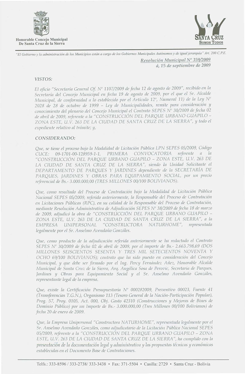 Aprueba el Contrato de la Secretaria de Parques, Jardines y Obras para Equipamiento Social No 30/2009 de fecha 02 de abril del 2009, por el importe de Bs.- 2,663,798,69 referente a la "Construcción del Parque Urbano Guapilo-Zona Este, UV-263 Distrito Municipal No 7 de la ciudad de Santa Cruz.