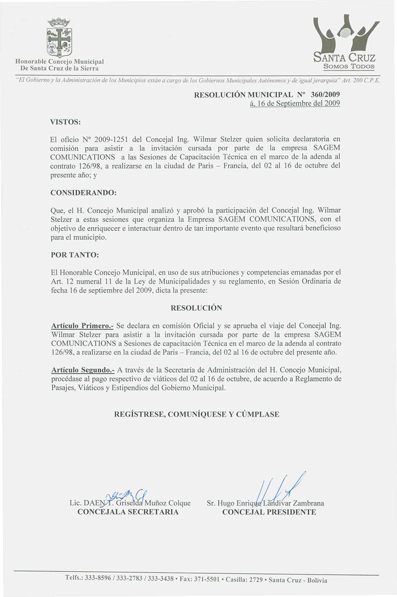 Declara en Comisión Oficial y se aprueba el viaje del Concejal Ing. Wilmar Stelzer para asistir a la invitación cursada por parte de la Empresa SAGEM COMUNICATIONS a Sesiones de capacitación, técnica en el marco de la adenda al contrato 126/98 a realizarse en la ciudad de Paris-Francia del 02 al 16 de octubre del presente.