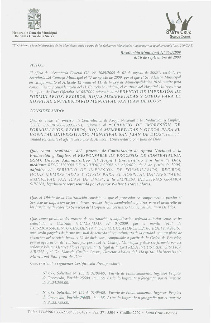 Aprueba el Contrato del Hospital Universitario Municipal San Juan de Dios N° 04/2009, por el monto total de Bs.- 152,014,55, para el "Servicio de Impresión de Formularios, recibos, hojas membretadas y otros para el Hospital Universitario Municipal San Juan de Dios.