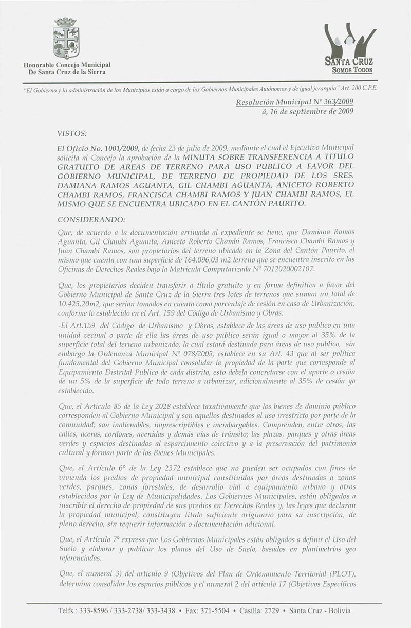 Aprueba la "Minuta de Transferencia a Titulo Gratuito de Cesión de área" que realizan los propietarios Sres. Damiana Ramos Aguanta, Gil Chambi Aguanta, Aniceto Roberto Chambi Ramos, Francisca Chambi Ramos y Juan Chambi Ramos terreno ubicado en la zona Sur-Este, Cantón Paurito denominado "Villa Viana".