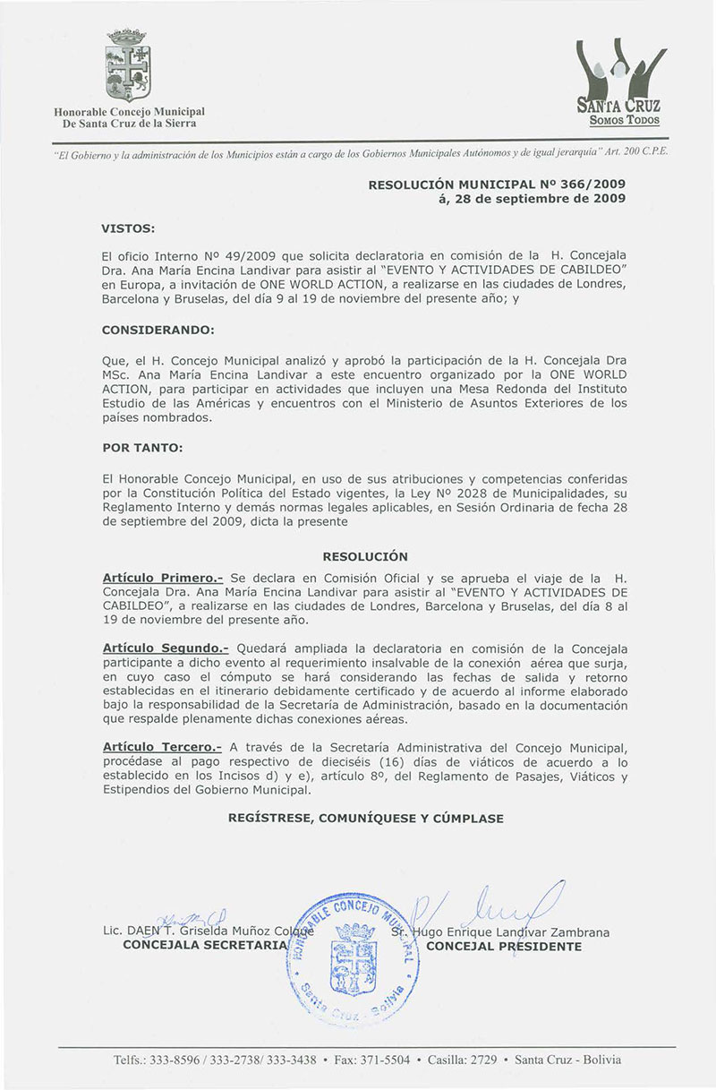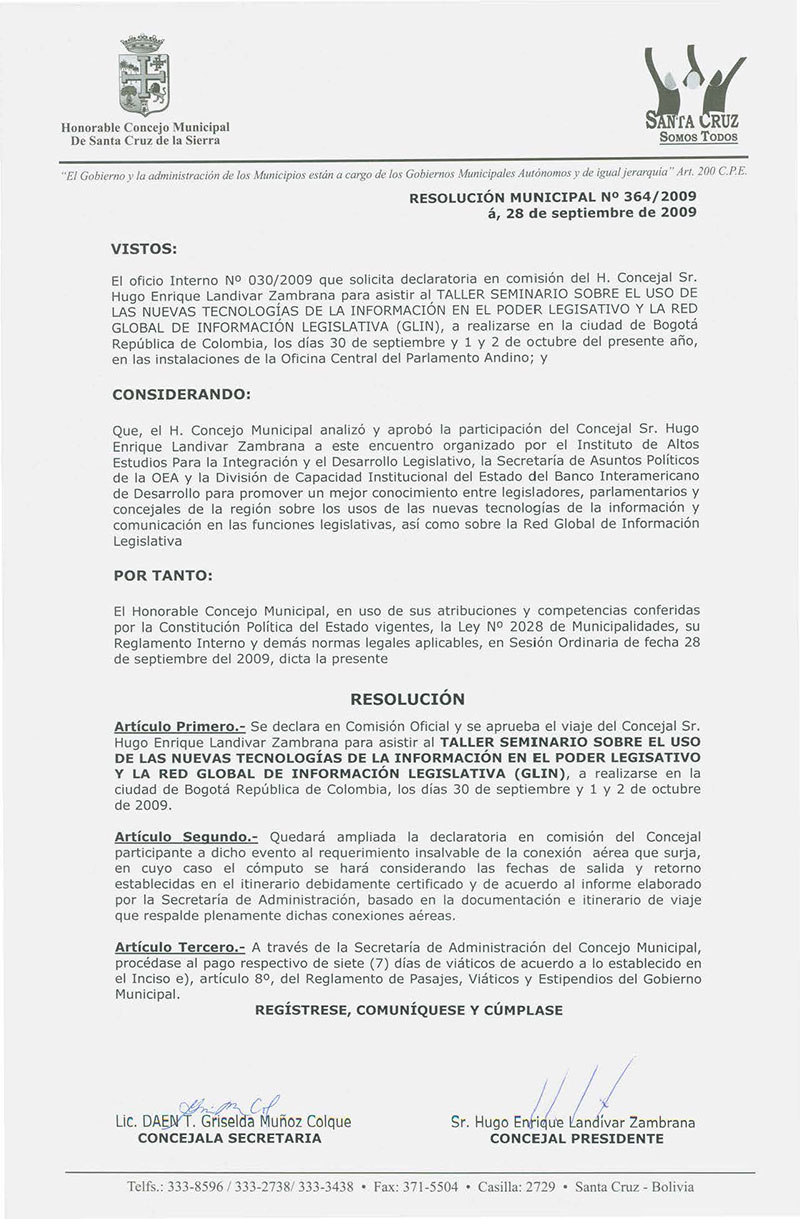 Declara en Comisión Oficial y se Aprueba el viaje del Concejal Sr. Hugo Enrique Landivar para asistir al Taller Seminario sobre el Uso de las Nuevas Tecnologías de la información en el poder legislativo y la red global de información legislativa (GLIN) a realizarse en la ciudad de Bogotá. República de Colombia, los días 30 de septiembre 1 y 2 de octubre de 2009.