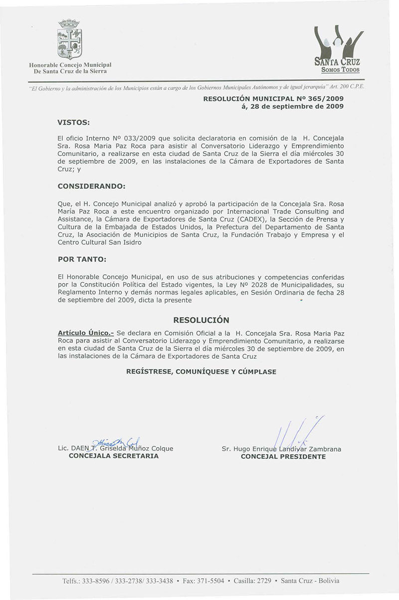 Declara en Comisión Oficial a la Concejala Sra. Rosa María Paz Roca para Asistir al Conversatorio Liderazgo y Emprendimiento Comunitario, a realizarse en esta ciudad, el día miércoles 30 de septiembre en las instalaciones de la Cámara de Exportadores de Santa Cruz.