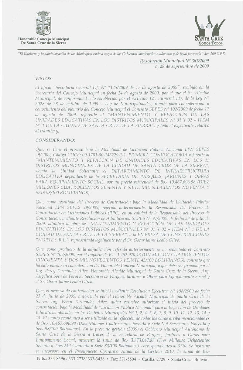 Aprueba el Contrato de la Secretaria de Parques, Jardines y Obras para Equipamiento Social No 102/2009 por el monto de Bs.- 1,452,920,43.- referente al "Mantenimiento y Refacción de las Unidades Educativas en los Distritos Municipales N° 1 y 2 - Item N° 1 de la ciudad de Santa Cruz de la Sierra.