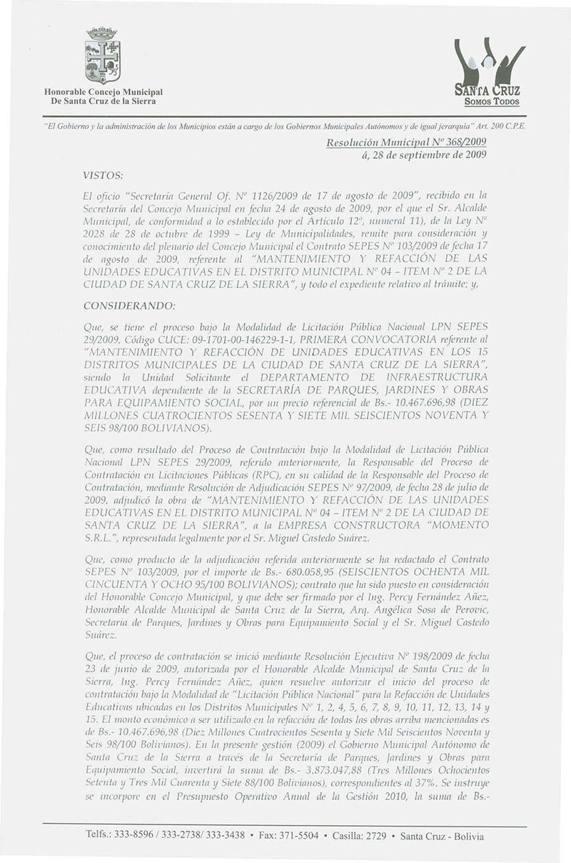 Aprueba el Contrato de la Secretaria de Parques, Jardines y Obras para Equipamiento Social No 103/2009 por el monto de Bs.- 680,058,95.- referente al "Mantenimiento y Refacción de las Unidades Educativas en los Distritos Municipales de Santa Cruz de la Sierra.