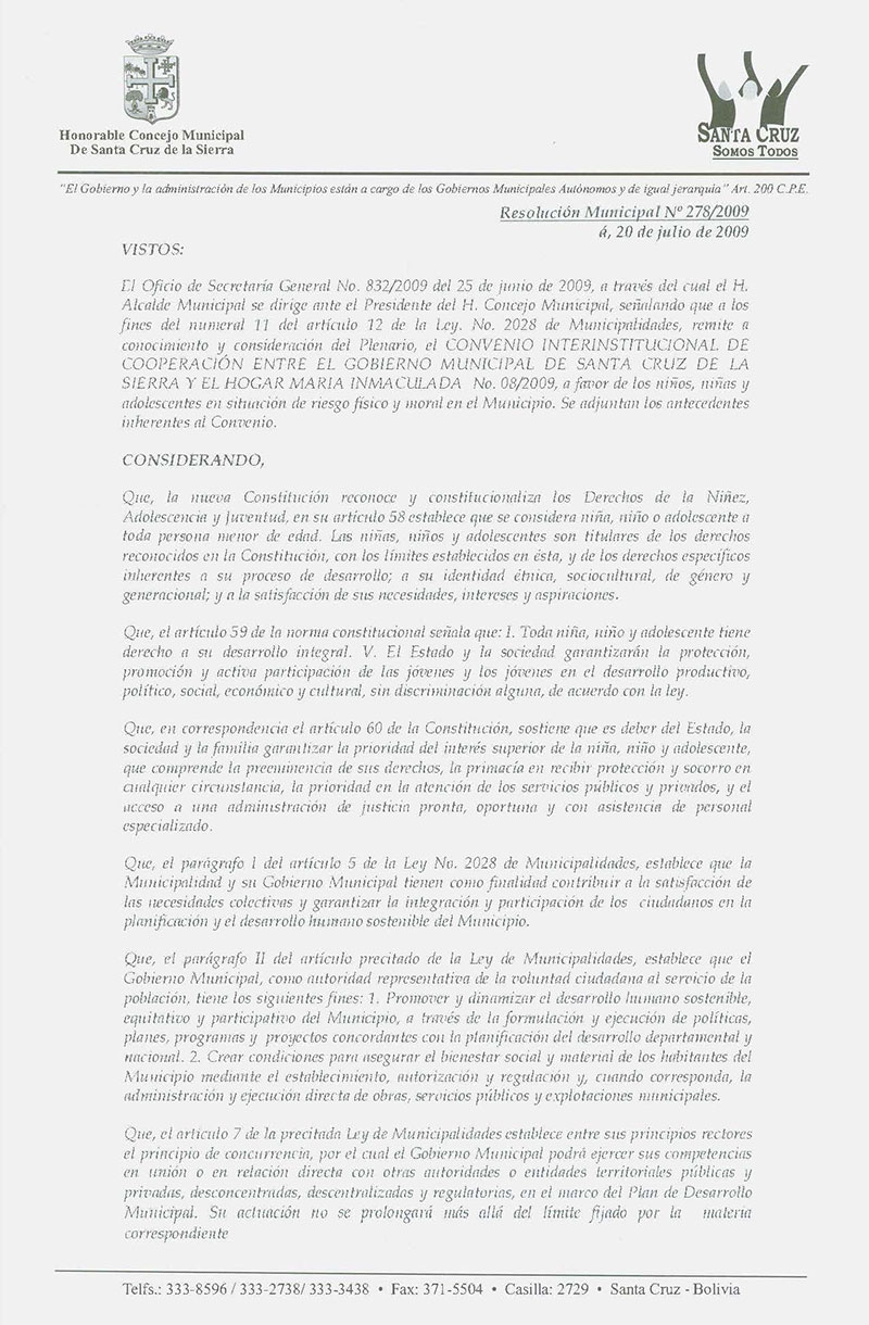 Aprueba la suscripción del Convenio Interinstitucional de Cooperación No 008/2009, suscrito entre el Gobierno Municipal de Santa Cruz de la Sierra y el Hogar María Inmaculada.