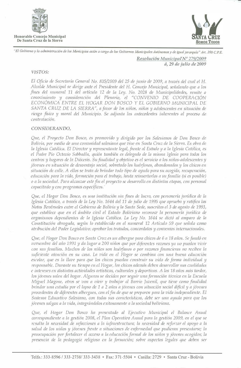 Aprueba la suscripción del Convenio de Cooperación Interinstitucional No 5/2009, entre el Gobierno Municipal de Santa Cruz de la Sierra y el Hogar Don Bosco.