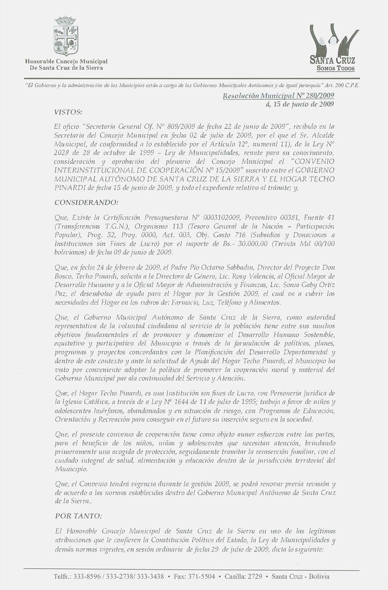 Aprueba el Convenio Interinstitucional de Cooperación No 15/2009 suscrito entre el Gobierno Municipal Autónomo y el Hogar Techo Pinardi.