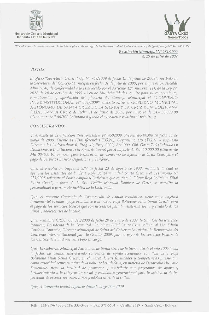 Aprueba el Convenio Interinstitucional N° 002/2009 suscrito entre el Gobierno Municipal Autónomo de Santa Cruz de la Sierra y La Cruz Roja Boliviana Filial Santa Cruz.