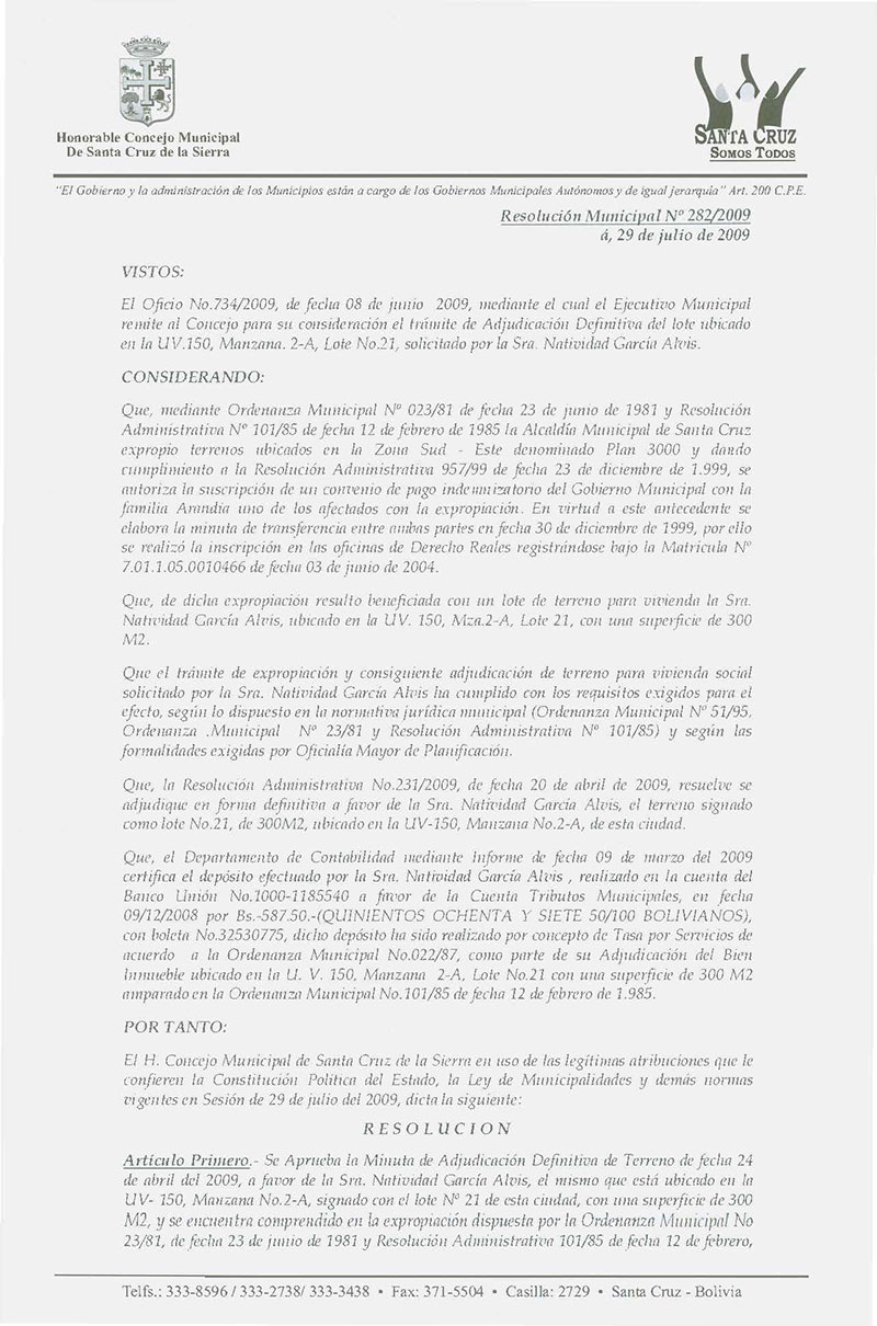 Aprueba la Minuta de Adjudicación definitiva de Terreno de fecha 24 de abril del 2009, a favor de la Sra. Natividad García Alvis, ubicado en la UV-150, Mza No 2-A, lote No 21 de esta Ciudad.